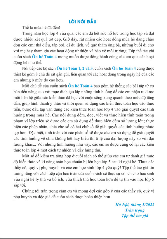 Một số đề kiểm tra tổng hợp ở cuối sách có thể giúp các em tự đánh giá mức độ kiến thức và kĩ năng toán học chuẩn bị lên học lớp 5 sau kì nghỉ hè. Thưa các thầy cô, quý vị phụ huynh và các em học sinh lớp 4 yêu quý! Tập thể tác giả tin tưởng rằng với cách tiếp cận học toán của cuốn sách sẽ thực sự có ích cho học sinh vừa nghỉ hè lý thú và bổ ích, vừa thích thú học toán hơn để tự tin vào học lớp 5 sắp tới.