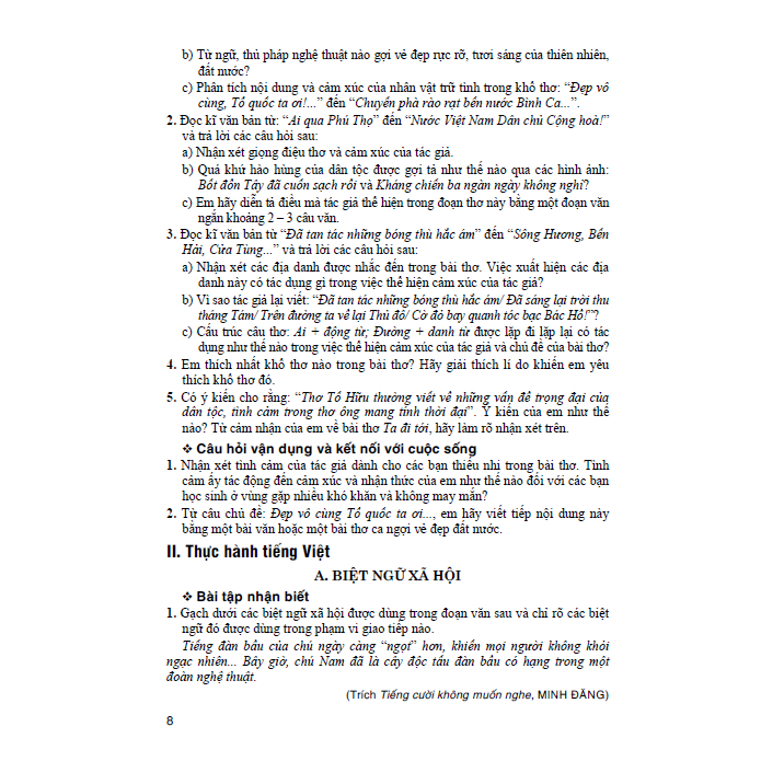 Trong phần này, cuốn sách đưa ra các gợi ý, hướng dẫn, tư liệu tham khảo, các thao tác để học sinh tự trả lời các câu hỏi và bài tập ở phần một nhằm phát triển năng lực ngôn ngữ và tư duy ở người học. Nhiều câu hỏi học sinh có thể tự trả lời theo hiểu biết và quan điểm cá nhân, khuyến khích sự độc lập suy nghĩ và sáng tạo.