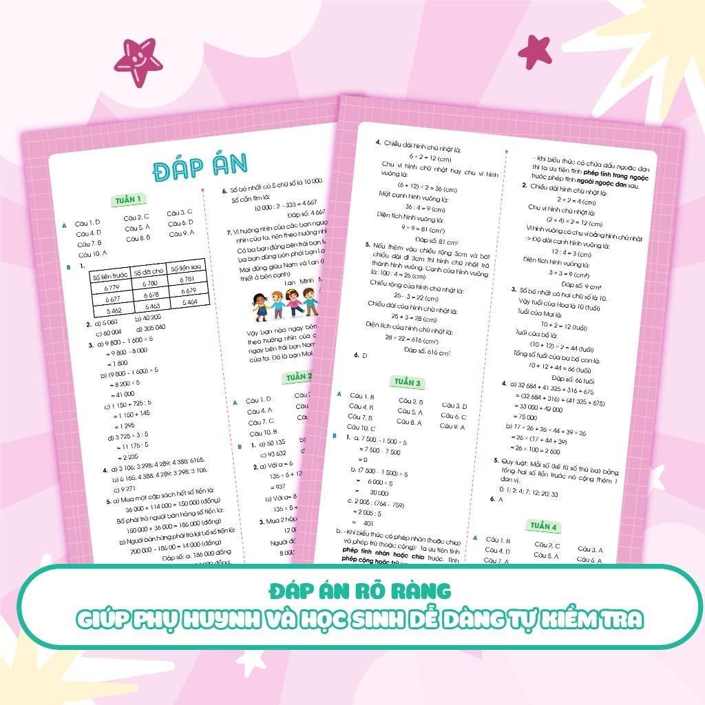 Phần đáp án chi tiết ở cuối sách giúp phụ huynh và các con có thể tự đối chiếu và đánh giá sau khi hoàn thành bài tập, từ đó có phương pháp ôn luyện phù hợp cho con.