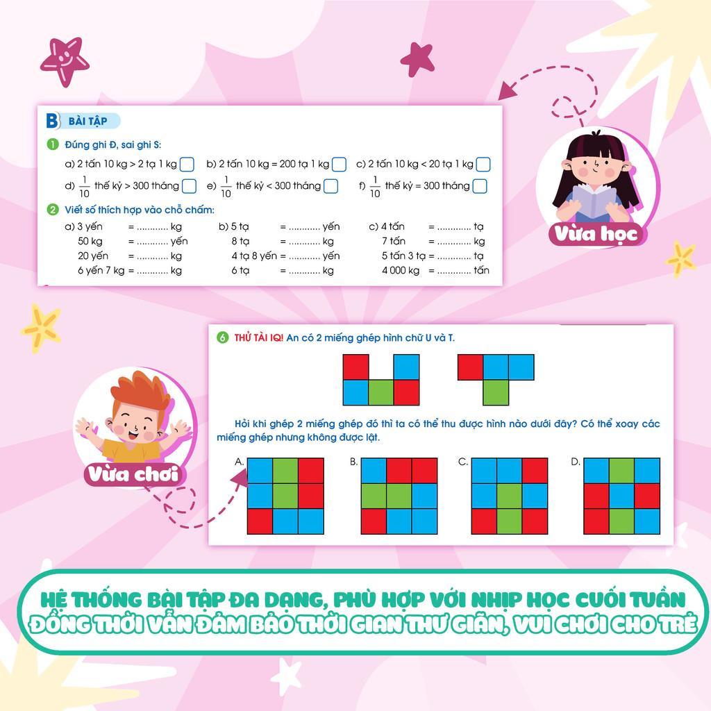 Sách được thiết kế với bố cục dễ hiểu với nhiều hình ảnh và được in màu sinh động giúp các con hứng thú với việc học vào những ngày cuối tuần.