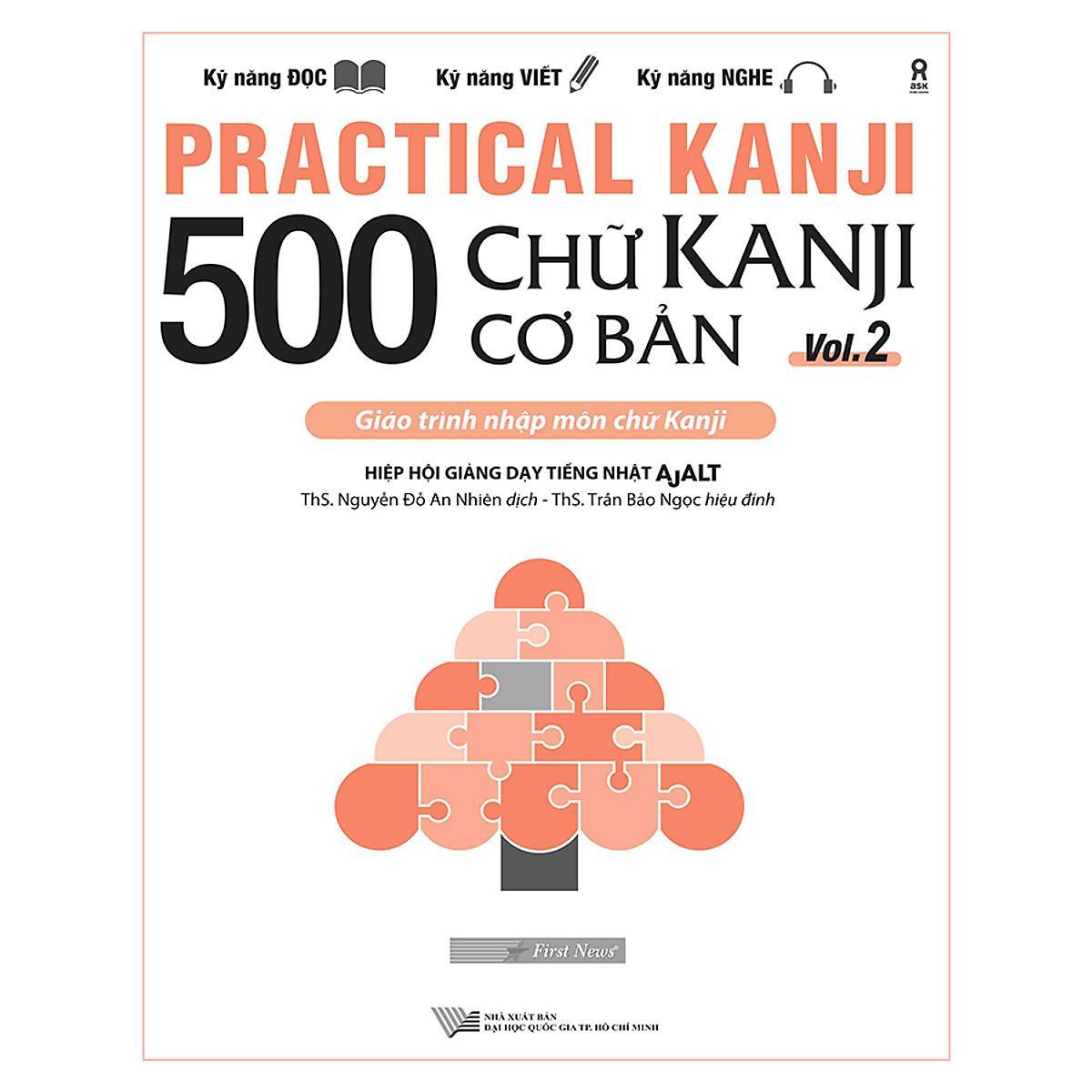 Practical Kanji Vol.2 – 500 chữ Kanji cơ bản Vol.2 là quyển sách thứ hai trong bộ giáo trình 500 Chữ Kanji cơ bản. Hướng dẫn cho người mới học 250 chữ Kanji (hay còn gọi là Hán tự ) tiếp theo, sau khi bạn đã luyện tập 250 chữ Kanji đầu tiên ở tập trước. Cuốn sách do Hiệp hội giảng dạy tiếng Nhật AJALT biên soạn, được thực hiện bởi , Nhà xuất bản Đại học Quốc gia TP. ấn hành.