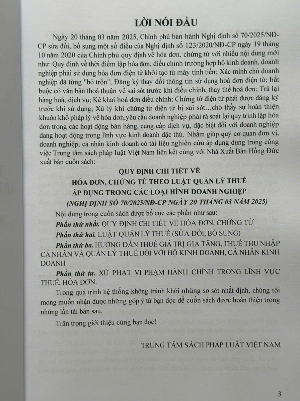 Nhằm giúp quý cơ quan đơn vị, doanh nghiệp, cá nhân kinh doanh nắm bắt kịp thời những quy định mới nêu trên. Nhà sách Nam Việt xin trân trọng giới thiệu cuốn sách: Quy định chi tiết về Hóa Đơn, Chứng Từ theo Luật QUẢN LÝ THUẾ áp dụng trong các loại hình Doanh Nghiệp theo Nghị định số 70/2025/NĐ-CP ngày 20/3/2025