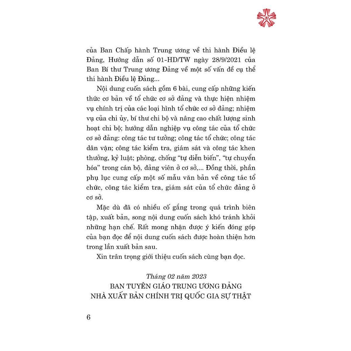 Nội dung cuốn sách gổm 6 bài, cung cấp những kiến thức cơ bản về tổ chức cơ sở đảng và thực hiện nhiệm vụ chính trị của các loại hình tố chức cơ sở đảng: nhiệm vụ của chi ủy, bí thư chi bộ và nâng cao chất lượng sinh hoạt chi bộ: hướng dẫn nghiệp vụ công tác của tổ chức cơ sở đảng: công tác tư tưởng; công tác tổ chức; công tác dân vận; công tác kiểm tra, giám sát và công tác khen thưởng, kỷ luật; phòng, chống "tự diễn biến”, “tự chuyển hóa" trong cán bộ, đảng viên ở cơ sở Đồng thời, phần phụ lục cung cấp một số mẫu văn bản về công tác tổ chức, công tác kiểm tra, giám sát của tổ chức đảng ở cơ sở.
