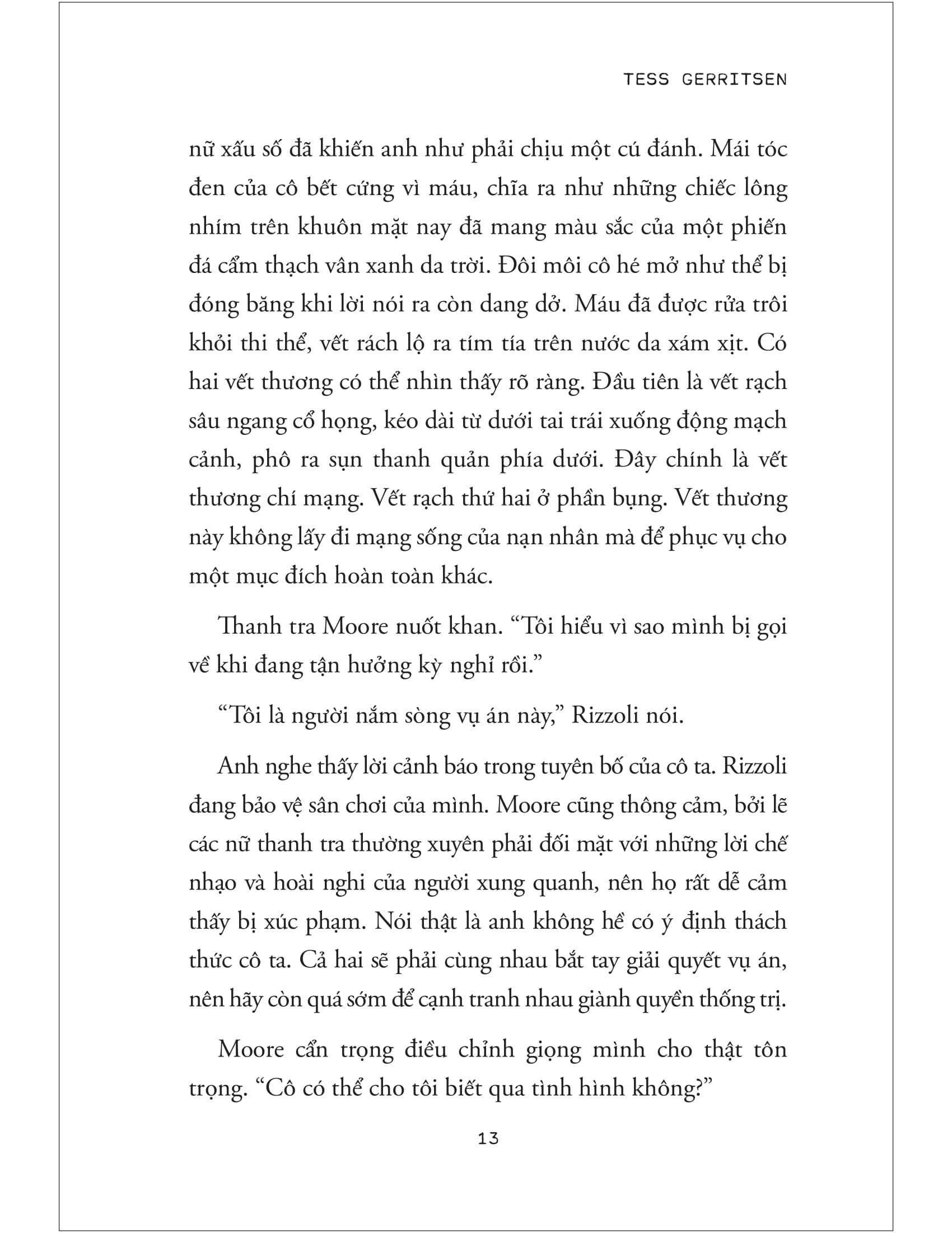 TESS GERRITSEN Là một bác sĩ chuyên nghiệp, Tess Gerritsen vốn mang trong m.ình tình yêu với những con chữ. Trong quá trình nghỉ thai sản, Tess đã viết truyện ngắn đầu tay của m.ình và giành giải nhất của một cuộc thi viết trên tạp chí Honolulu. Từ đó, bà quyết định theo đuổi đam mê viết lách.