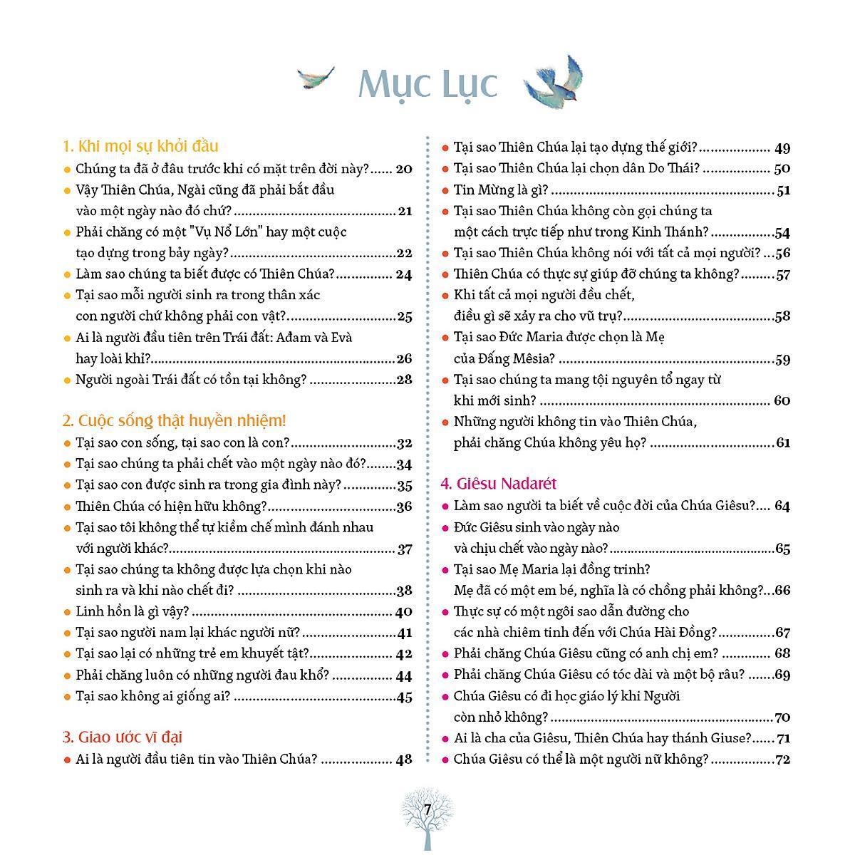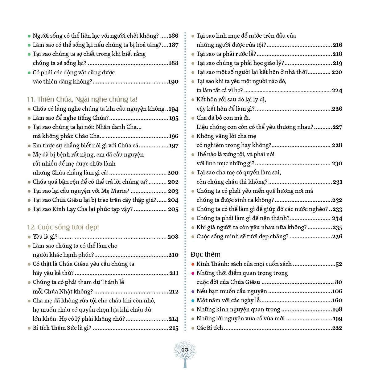 Ai đã trả lời các câu hỏi này? Đó là một nhóm gồm các bậc cha mẹ, nhà báo, linh mục. Những người này có rất nhiều kinh nghiệm nói chuyện với trẻ em về những thứ liên quan đến cuộc sống và đức tin. Họ trả lời rất nghiêm túc những câu hỏi mà các em đặt ra. Với sự kiên nhẫn, họ trả lời từng câu một. Đồng thời, họ cố gắng hiểu rõ điều mà mỗi em muốn hỏi. Để giúp các em hiểu rõ, họ sử dụng từ ngữ đơn giản, nhưng không bao giờ đánh lừa các em. Họ nói những gì họ tin, những gì họ biết, những gì họ khám phá trong cuộc sống, những gì đã giúp họ sống đến hôm nay. Đương nhiên, khi tất cả các câu hỏi này được trả lời thì cuốn sách trở nên dày cộm! Bởi vậy, các em không thể chỉ đọc nó một lần từ đầu đến cuối rồi thôi, nhưng phải đọc tới đọc lui. Các em dừng lại khi gặp câu hỏi mà mà chính các em thắc mắc. Hoặc một câu hỏi thú vị khác mà các em chưa từng nghĩ đến. Cứ như thế, qua từng trang sách, ngày này qua ngày khác, các em tiến tới. Các em sẽ khám phá ra những kho báu nhỏ thực sự quý giá giúp các em hiểu thấu các vấn đề, hoặc những sự giải thích khoa học và thú vị. Các em hãy giữ cuốn sách này bên cạnh mình để khám phá mỗi ngày một ý tưởng mới. Khi đêm về, các em thấy mình lớn lên và ước muốn tiến bước trong cuộc sống.