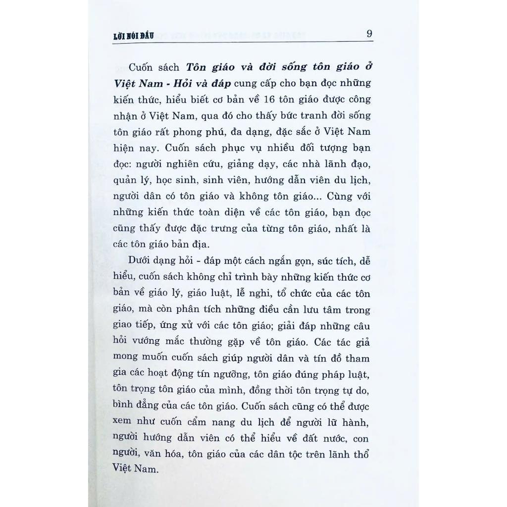 Cuốn sách Tôn giáo và đời sống tôn giáo ở Việt Nam - Hỏi và đáp cung cấp cho bạn đọc những kiến thức, hiểu biết cơ bản về 16 tôn giáo được công nhận ở Việt Nam, qua đó cho thấy bức tranh đời sống tôn giáo rất phong phú, đa dạng, đặc sắc ở Việt Nam hiện nay. Cuốn sách phục vụ nhiều đối tượng bạn đọc: người nghiên cứu, giảng dạy, các nhà lãnh đạo, quản lý, học sinh, sinh viên, hướng dẫn viên du lịch, người dân có tôn giáo và không tôn giáo... Cùng với những kiến thức toàn diện về các tôn giáo, bạn đọc cũng thấy được đặc trưng của từng tôn giáo, nhất là các tôn giáo bản địa.