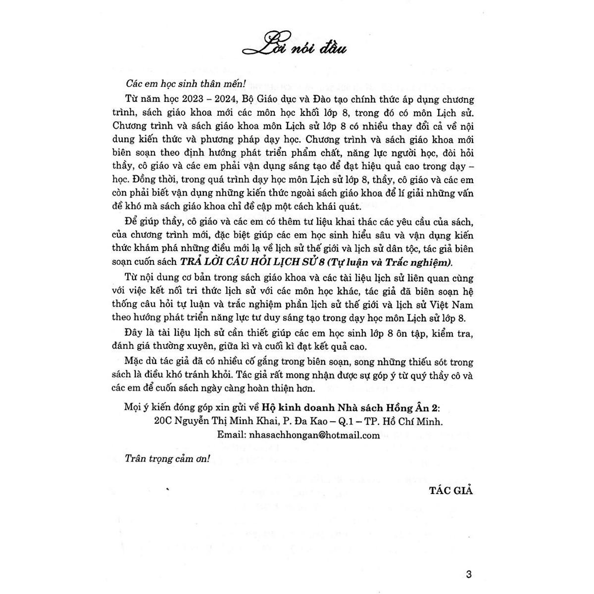 sách TRẢ LỜI CÂU HỎI LỊCH SỬ 8 (Tự luận và Trắc nghiệm).