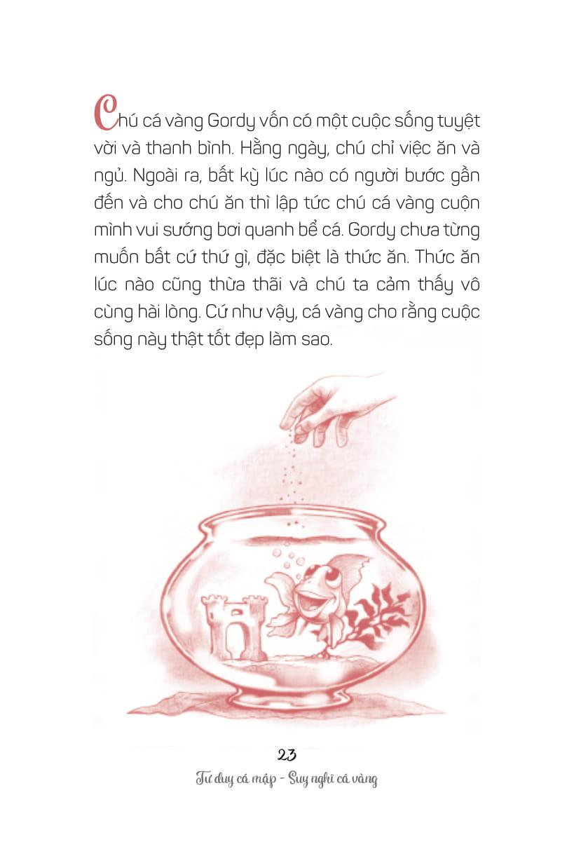 Tập sách dành cho những người đang muốn vượt thoát thử thách của cuộc sống. Tư duy cá mập suy nghĩ cá vàng là câu chuyện về chú cá vàng Gordy yếu đuối, nhút nhát và bác cá mập Sammy anh hùng, dũng cảm.– Một Thế Giới