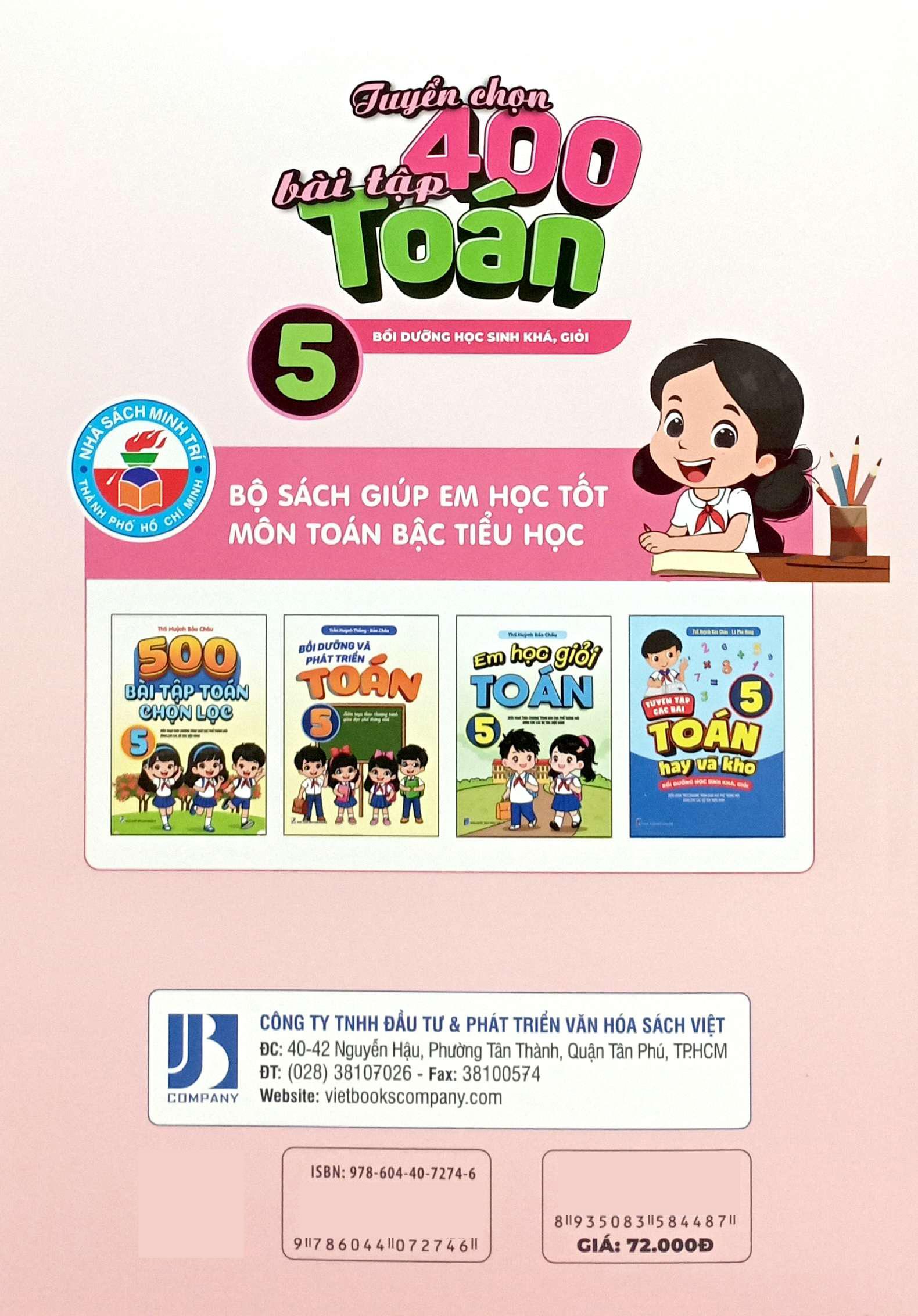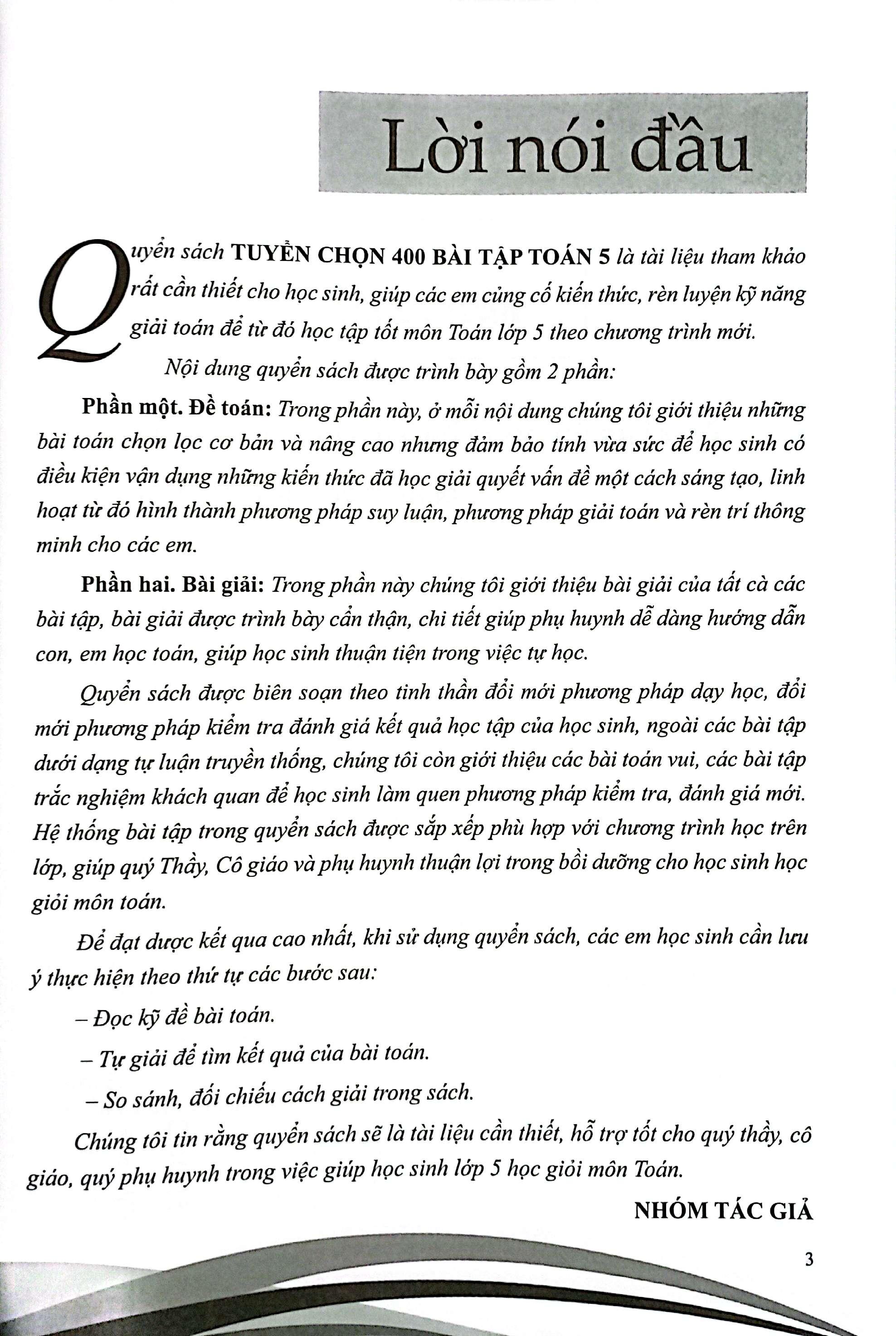 Quyển sách TUYỂN CHỌN 400 BÀI TẬP TOÁN 5 là tài liệu tham khảo rất cần thiết cho học sinh, giúp các em củng cố kiến thức, rèn luyện kỹ năng giải toán để từ đó học tập tốt môn Toán lớp 5 theo chương trình mới.