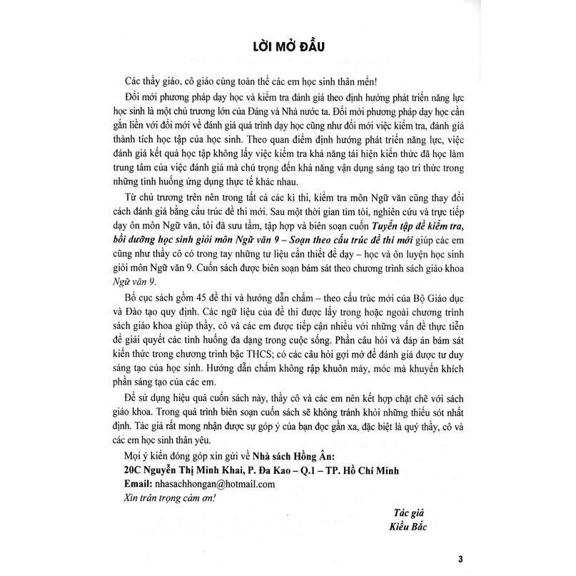 Xuất phát từ chủ trương trên, các kì thi, kiểm tra môn Ngữ văn đã thay đổi cách đánh giá bằng cấu trúc đề thi mới. Sau một thời gian tìm tòi, nghiên cứu và trực tiếp dạy ôn môn Ngữ văn, tôi đã sưu tầm và biên soạn cuốn Tuyển tập đề kiểm tra môn Ngữ văn 9 (Theo cấu trúc mới) nhằm giúp các em cũng như thầy cô có tư liệu tham khảo để dạy – học và ôn luyện học sinh giỏi môn Ngữ văn 9.