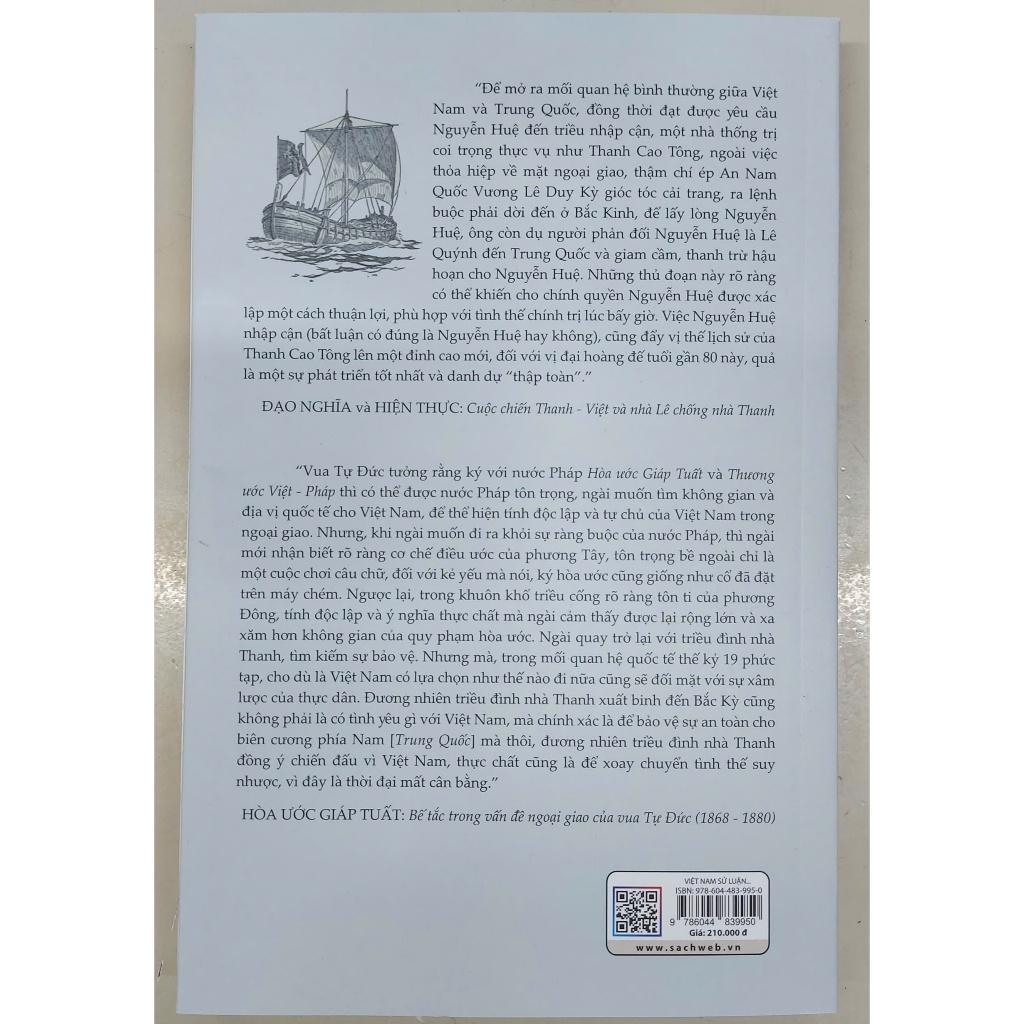 “Vua Tự Đức tưởng rằng ký với nước Pháp Hòa ước Giáp Tuất và Thương ước Việt - Pháp thì có thể được nước Pháp tôn trọng, ngài muốn tìm không gian và địa vị quốc tế cho Việt Nam, để thể hiện tính độc lập và tự chủ của Việt Nam trong ngoại giao. Nhưng, khi ngài muốn đi ra khỏi sự ràng buộc của nước Pháp, thì ngài mới nhận biết rõ ràng cơ chế điều ước của phương Tây, tôn trọng bề ngoài chỉ là một cuộc chơi câu chữ, đối với kẻ yếu mà nói, ký hòa ước cũng giống như cổ đã đặt trên máy chém. Ngược lại, trong khuôn khổ triều cống rõ ràng tôn ti của phương Đông, tính độc lập và ý nghĩa thực chất mà ngài cảm thấy được lại rộng lớn và xa xăm hơn không gian của quy phạm hòa ước. Ngài quay trở lại với triều đình nhà Thanh, tìm kiếm sự bảo vệ. Nhưng mà, trong mối quan hệ quốc tế thế kỷ 19 phức tạp, cho dù là Việt Nam có lựa chọn như thế nào đi nữa cũng sẽ đối mặt với sự xâm lược của thực dân. Đương nhiên triều đình nhà Thanh xuất binh đến Bắc Kỳ cũng không phải là có tình yêu gì với Việt Nam, mà chính xác là để bảo vệ sự an toàn cho biên cương phía Nam [Trung Quốc] mà thôi, đương nhiên triều đình nhà Thanh đồng ý chiến đấu vì Việt Nam, thực chất cũng là để xoay chuyển tình thế suy nhược, vì đây là thời đại mất cân bằng."