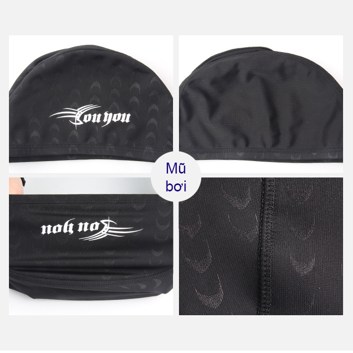 - Set đồ bao gồm: Quần bơi + Kính bơi + Mũ bơi + Bịt tai + Kẹp mũi + Túi đựng.