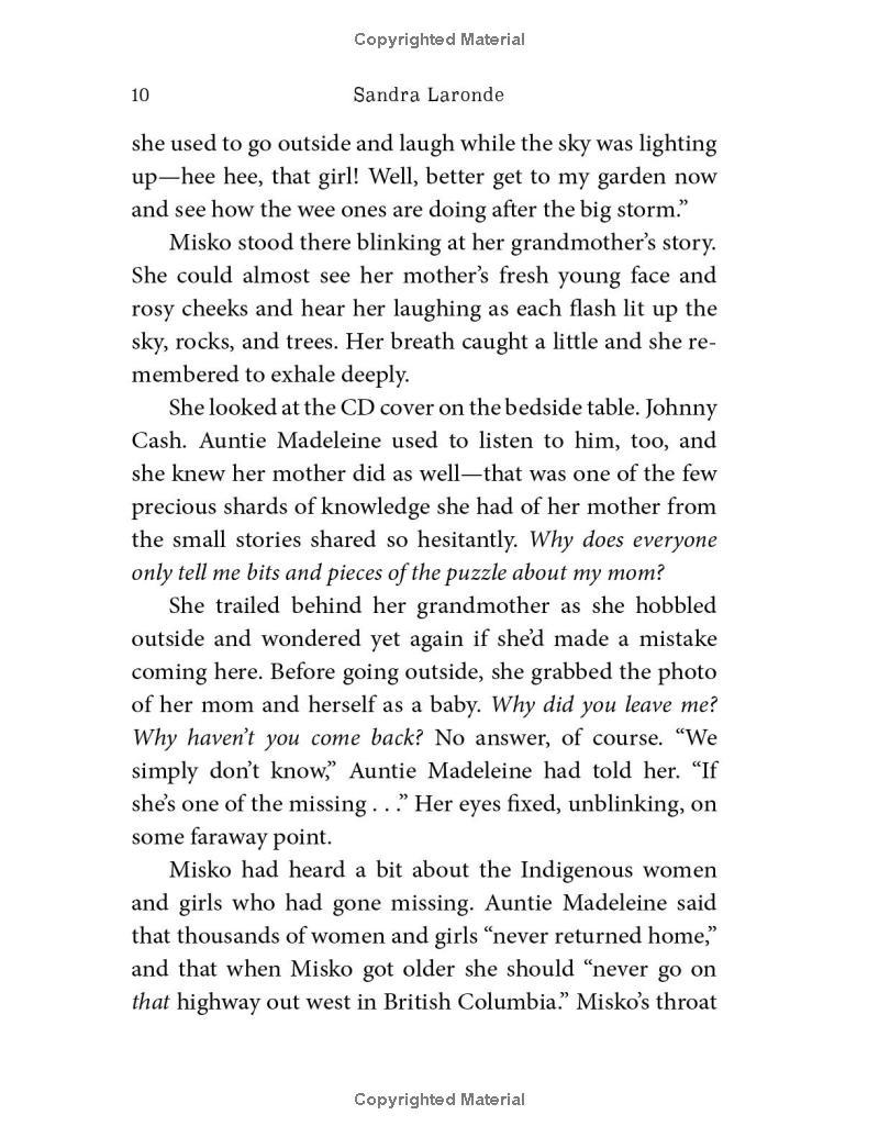 The last thing that twelve-year-old Misko wants to do is to move away from the city to spend time on the rez with her grandmother. And yet she feels strangely compelled to go, drawn by a pull she feels in her dreams. Maybe she can finally find out what happened to her mother, who mysteriously disappeared when Misko was four years old.