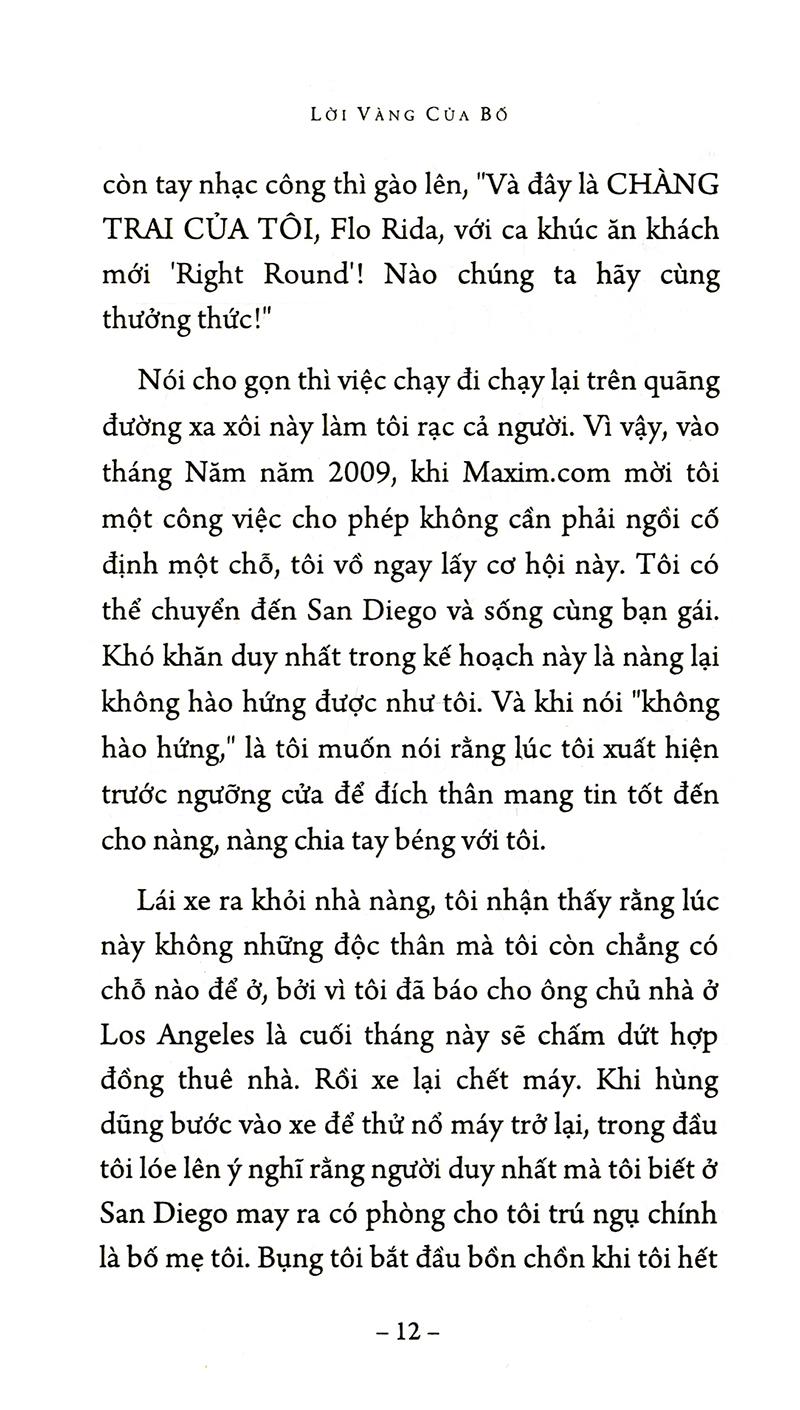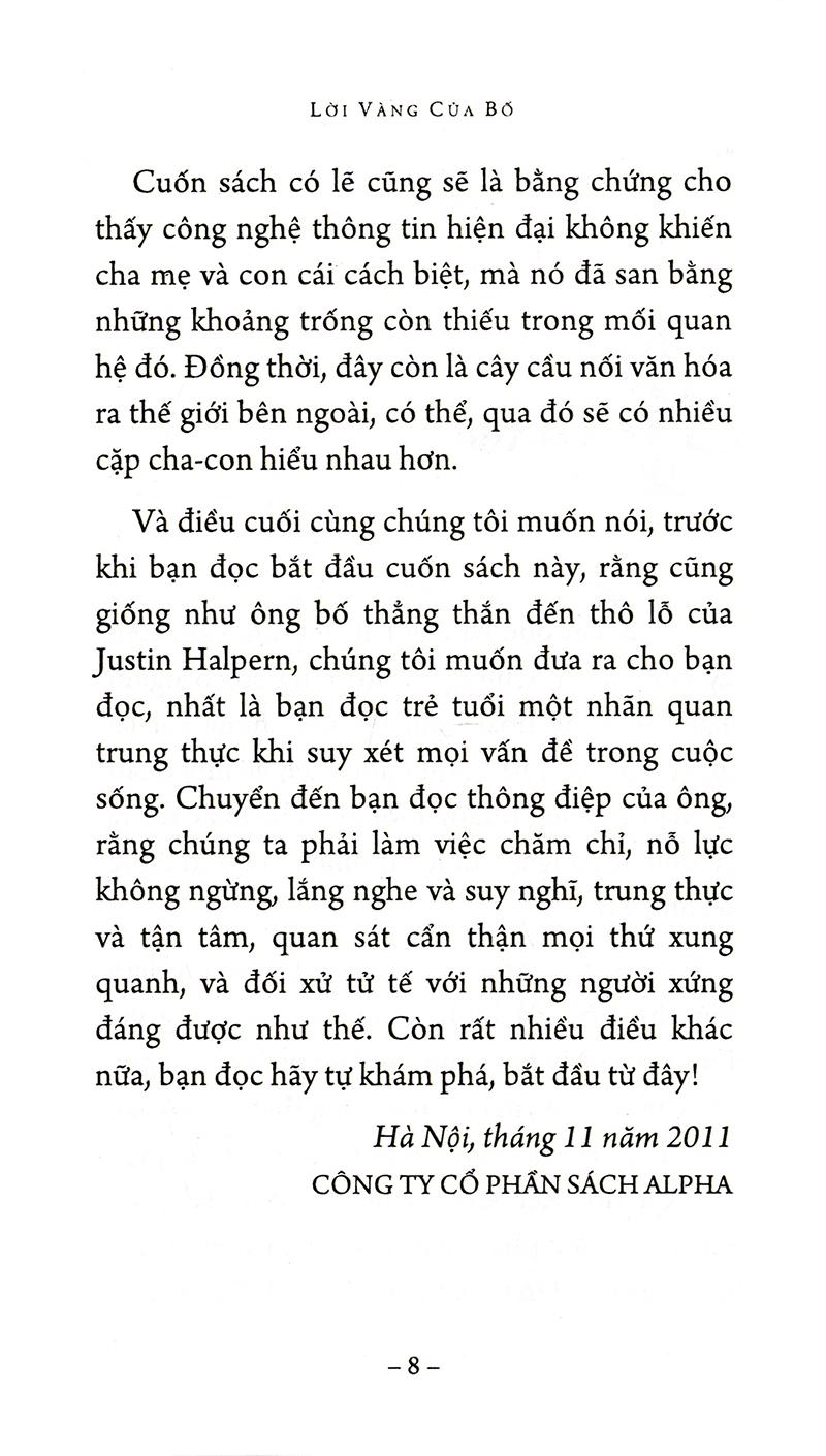 Shit My Dad Say - Lời vàng của bố sẽ giúp độc giả hình dung về cuộc sống gia đình người Mỹ trung lưu, không phải cuộc sống trong phim ảnh, mà là cuộc sống thật với vô vàn khó khăn của nó. Đó là các nhà biên kịch tương lai làm bồi bàn trong nhà hàng, và chuyên gia trong lĩnh vực “dược phẩm hạt nhân” làm việc cật lực hàng ngày tới tận tối khuya với rất nhiều áp lực.