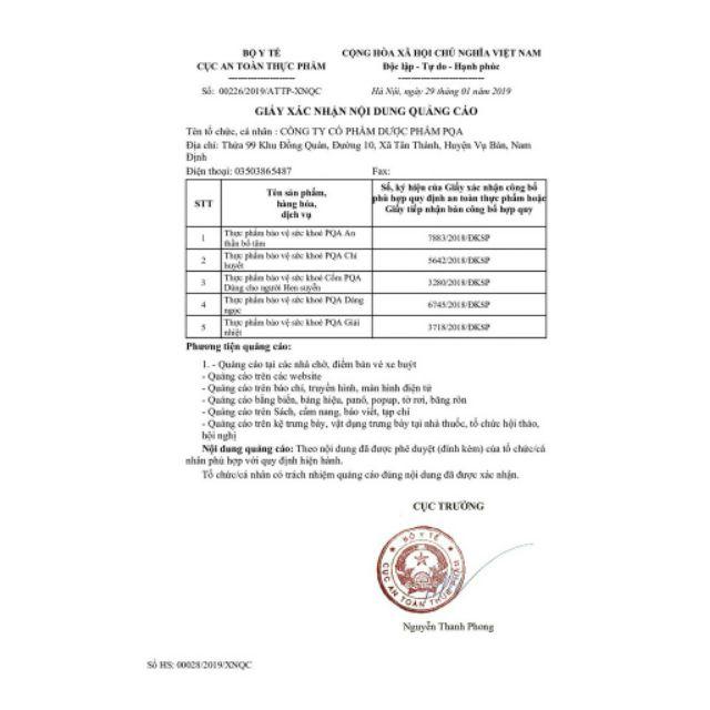 - Địa chỉ sản xuất: Công ty Cổ phần Dược phẩm PQA. Thửa 99, Khu Đồng Quàn, Xã Tân Thành, Huyện Vụ Bản, Tỉnh Nam Định. THÀNH PHẦN: