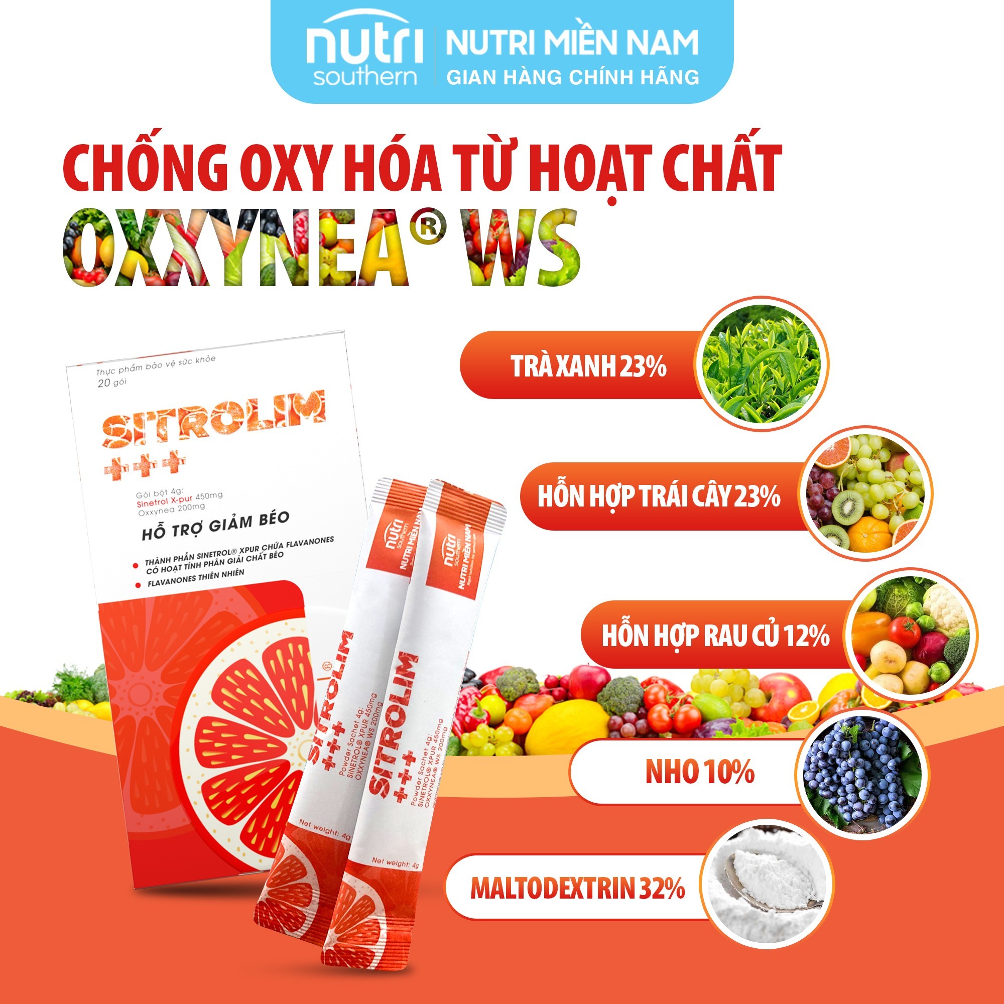 OXXYNEA WS (Chiết xuất trà xanh (23%); Hỗn hợp trái cây (23%) (quả mâm xôi, bưởi, đu đủ, dứa, dâu, táo, mơ, anh đào, cam, lý chua đen); Hỗn hợp rau củ (12%) (Cà rốt, cà chua, bông cải xanh, bắp cải xanh, hành tây, tỏi, măng tây, dưa chuột, ô liu); Chiết xuất nho (hạt nho và thịt nho) (10%; Maltodextrin (32%)): 200 mg