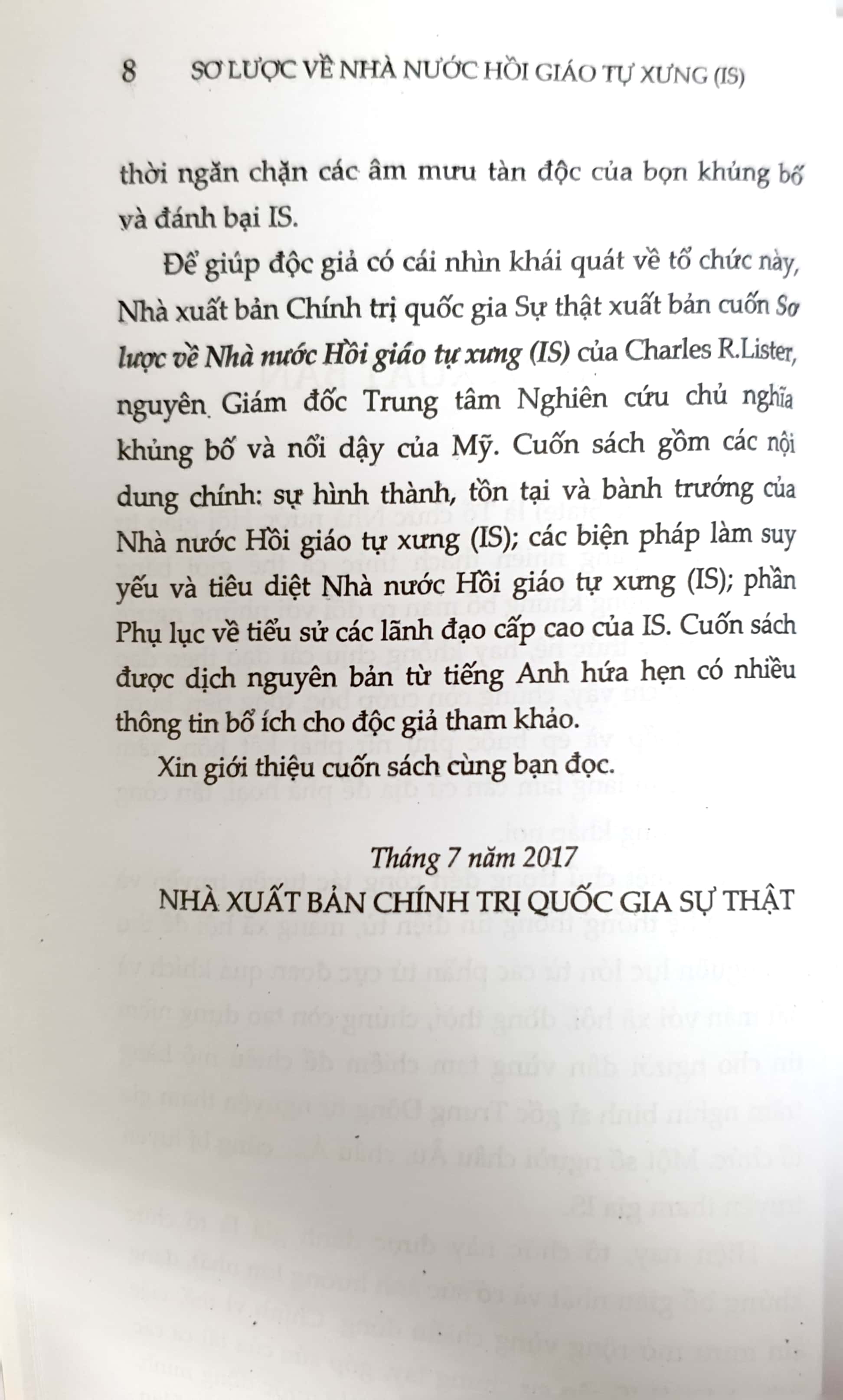 Cuốn sách bao gồm các nội dung chính: sự hình thành, tồn tại và bành trướng của Nhà nước Hồi giáo tự xưng (IS); các biện pháp làm suy yếu và tiêu diệt Nhà nước Hồi giáo tự xưng (IS); phần phụ lục về tiểu sử các lãnh đạo cấp cao IS.