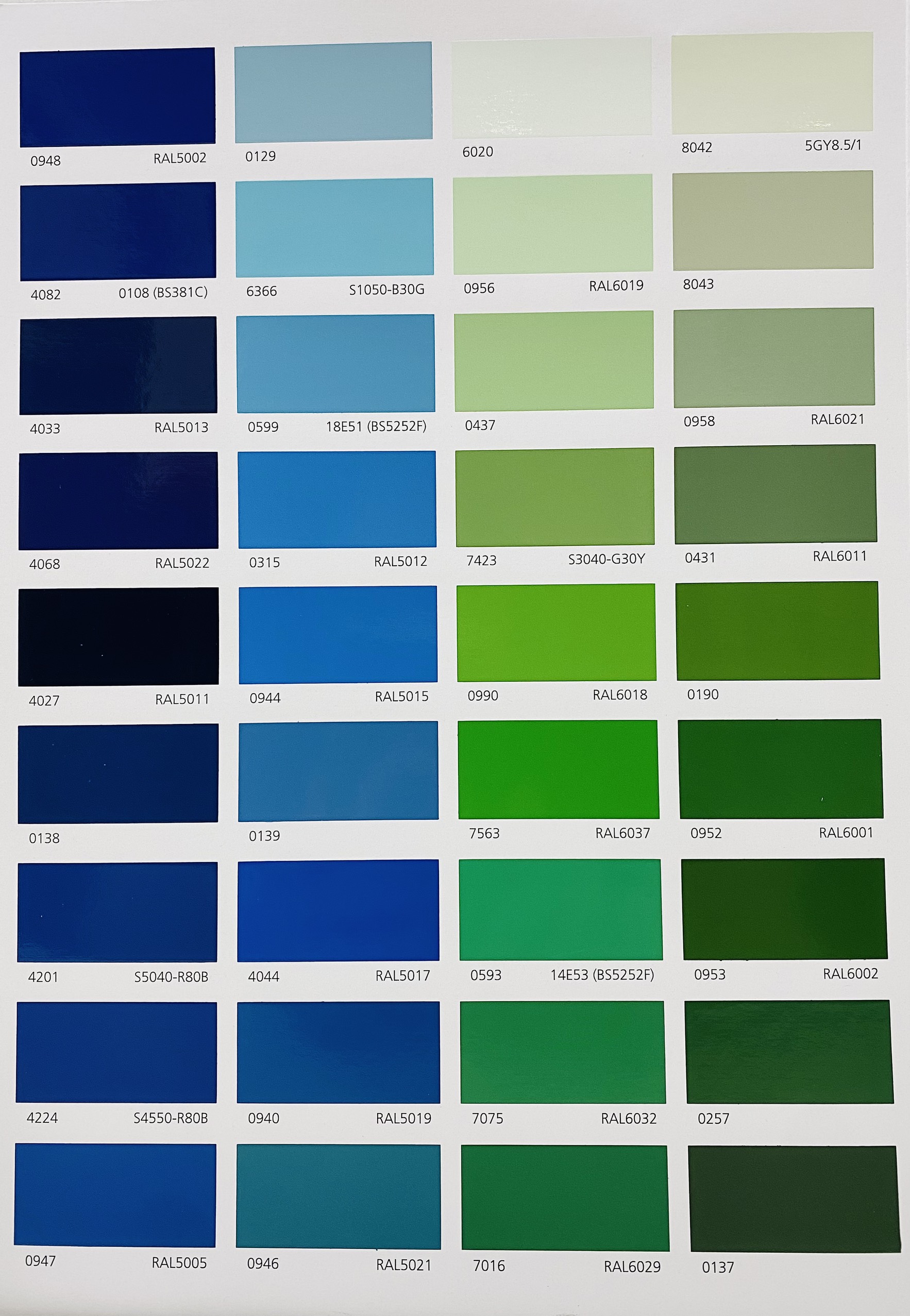 - Màu sắc: Đỏ Red ral 3000(926) , Trắng White, Xanh Blue 138, Blue 139, Đen ral 9005; Blue 599, Green 257, Green 7075, Xám Grey 38, grey 71, Grey 149, Vàng đất Yellow 414, Bạc Aluminium, …. Và nhiều màu theo bảng màu RAL quốc tế.