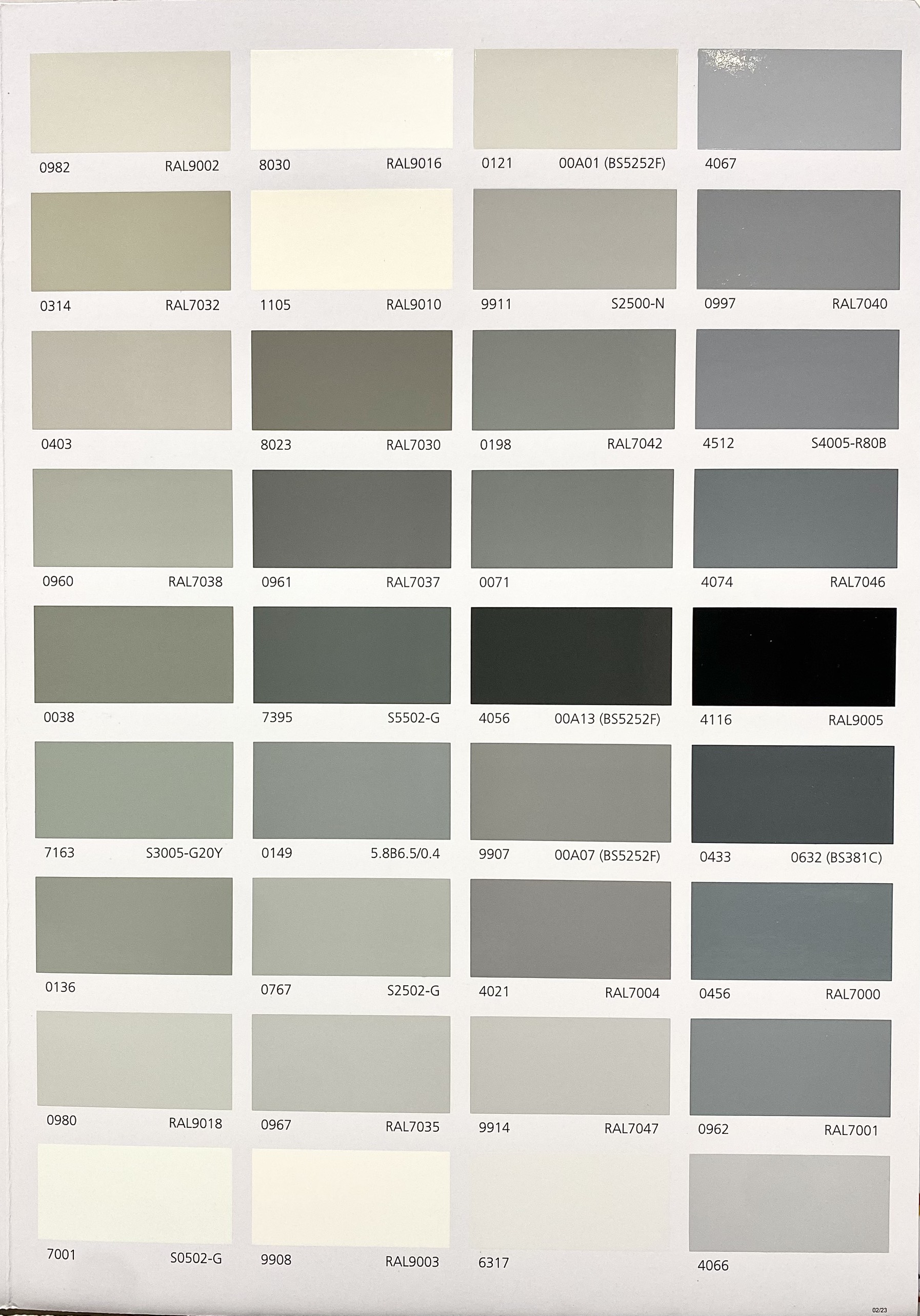 Màu sắc sơn công nghiệp Jotun : Theo bảng màu và hệ thống pha sơn công nghiệp tự động (MCI) Ivory White 566, Yellow 414, Orange 436, Yellow 258, Red 926 (Ral 3000), Ral 1004, Red 49, White 0001, Black 0099, Ral 3013, Tomato Red 2079, Ral 2001, Yellow 2, Green 137, Signal Green 7075, Ral 6032, Green 431, Green 437, Blue 139, Blue 599, Blue 129, Grey 38, grey 136, Grey 403, Light grey 967, Ral 7035, Grey 433, Grey 149, Grey 456, Ral 7000, Ral 5002, Ral 5005, Ral 6000, Ral 6001, Ral 6011, Ral 1003, Ral 1015, Ral 3020, Ral 8017, Ral 9001…