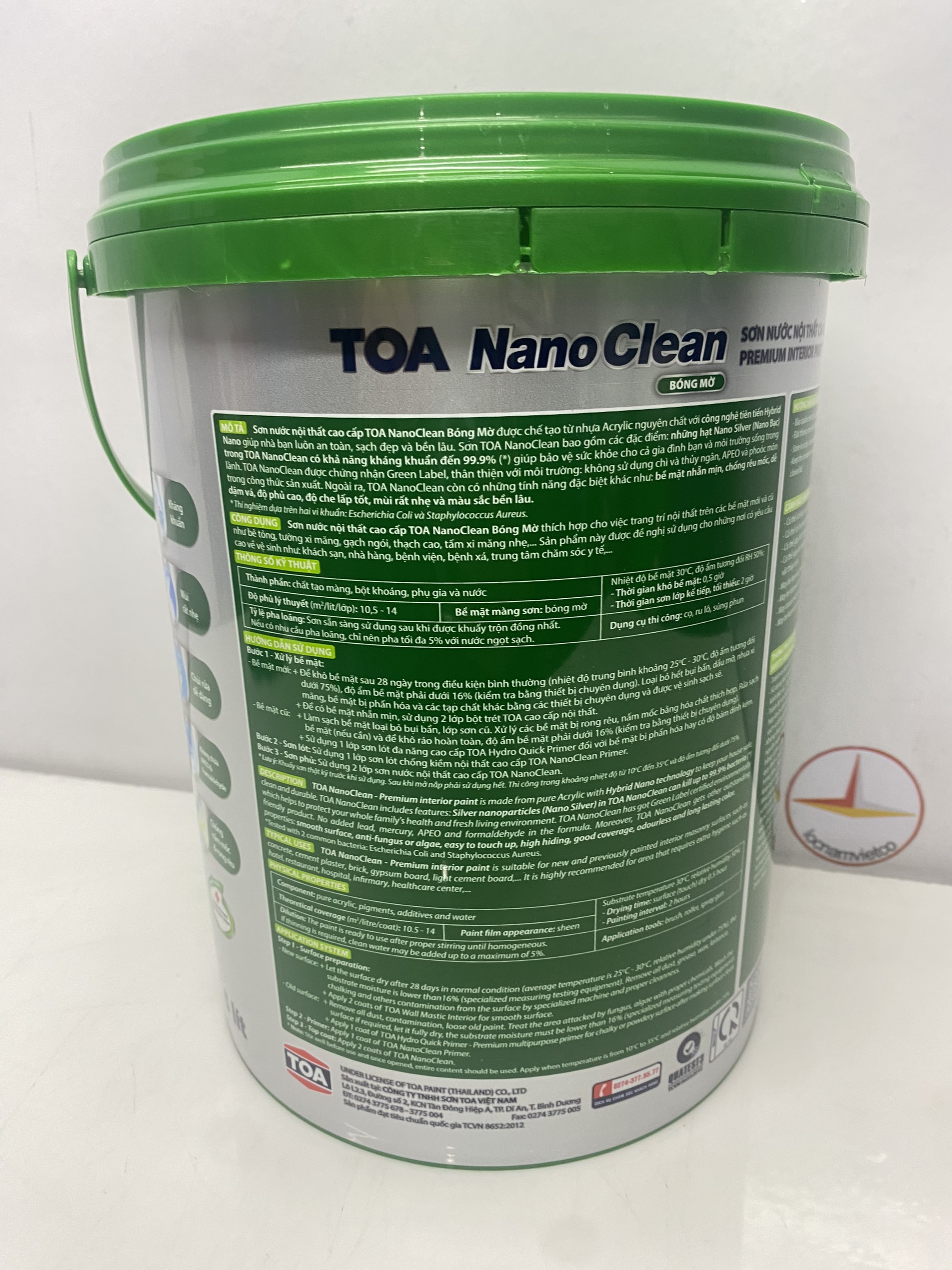 - Được chế tạo từ nhựa acrylic nguyên chất với công nghệ tiên tiến nano giúp nhà bạn luôn an toàn, sạch sẽ và bền lâu. - Những hạt Nano Silver (Nano Bạc) trong TOA NanoClean có khả năng kháng khuẩn đến 99,9%(*) giúp bảo vệ sức khỏe cho gia đình bạn và môi trường trong lành. - TOA NanoClean được chứng nhận là sản phẩm xanh, thân thiện với môi trường, không sử dụng chì, APEO và phoóc-môn trong công thức sản xuất. - Ngoài ra, TOA NanoClean còn có những tính năng đặc biệt khác như: bề mặt nhẵn mịn, chống rêu mốc, dễ dặm vá, độ phủ cao, độ che lấp tốt, mùi rất nhẹ, dễ chịu và màu sắc bền lâu.