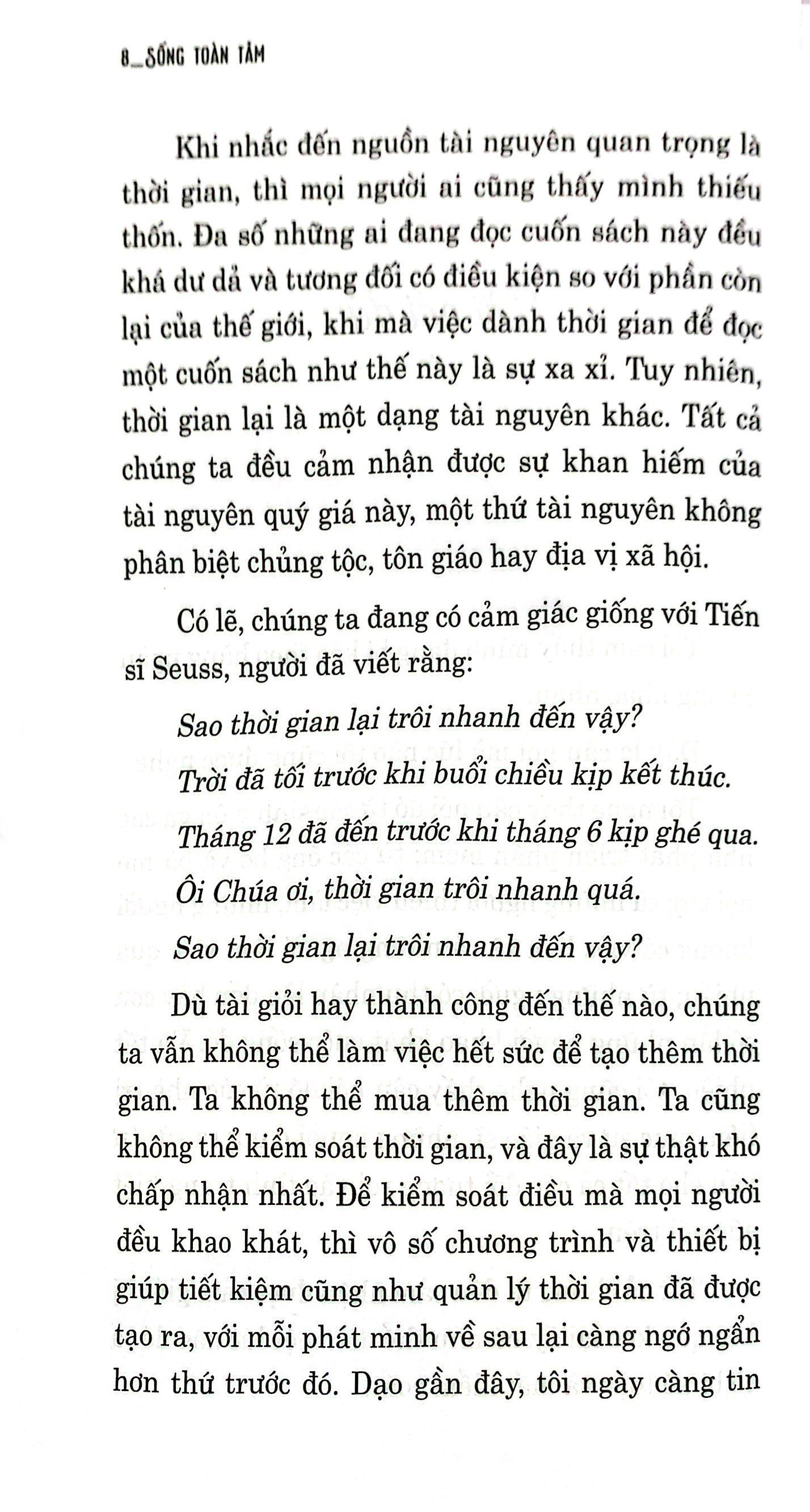 - John Ortberg, tác giả cuốn All the Places to G How Will You Know? - Trong cuộc sống hối hả và đầy áp lực như hiện nay, chúng ta có cảm giác như đang bị kéo đi theo hàng ngàn hướng khác nhau. Tất cả mọi người đều cảm nhận được những cảm giác khó chịu ấy, một sự bận rộn điên cuồng gây kiệt sức và đe dọa hủy hoại chúng ta. Ai cũng nghĩ m.ình biết rõ giải pháp cho vấn đề này – giải lao, thư giãn và nghỉ ngơi nhiều hơn. Nhưng sự thật không phải như vậy. Tác giả DeGroat đã khám phá ra giải pháp đích thực dành cho tình trạng này chính là việc sống toàn tâm để thay đổi từ trong ra ngoài. Qua SỐNG TOÀN TÂM, bạn sẽ học được cách chấp nhận những khía cạnh không hoàn hảo của m.ình, thể hiện lòng trắc ẩn với bản thân và kết nối với bản thể đích thực, để từ đó hướng đến một cuộc sống thống nhất và toàn vẹn.