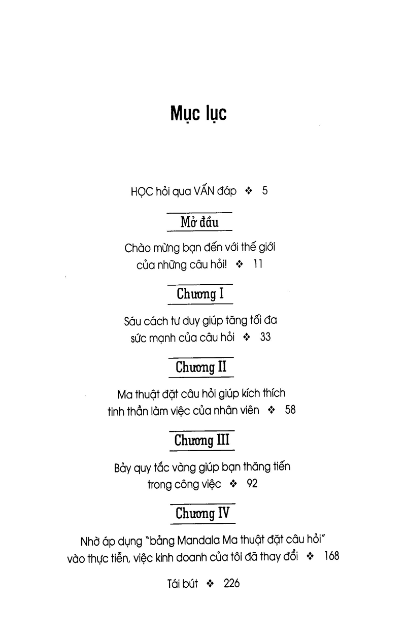 Thông qua cuốn sách Sức mạnh của việc đặt câu hỏi đúng, bạn đang cầm trên tay, chúng ta sẽ biết được rằng việc đặt ra các câu hỏi đúng rất quan trọng. Làm cách nào để đưa ra câu hỏi đúng đắn? Cuốn sách này sẽ là lời giải đáp thỏa đáng cho câu hỏi của bạn. Nó cung cấp cho bạn phương pháp đặt câu hỏi đúng và hiệu quả nhất, nó sẽ thay đổi chính bản thân bạn và đội ngũ của mình. Cuốn sách này thực sự là một món quà vô cùng quý giá. Hãy nghiền ngẫm và khám phá thế giới ma thuật: Đặt câu hỏi .