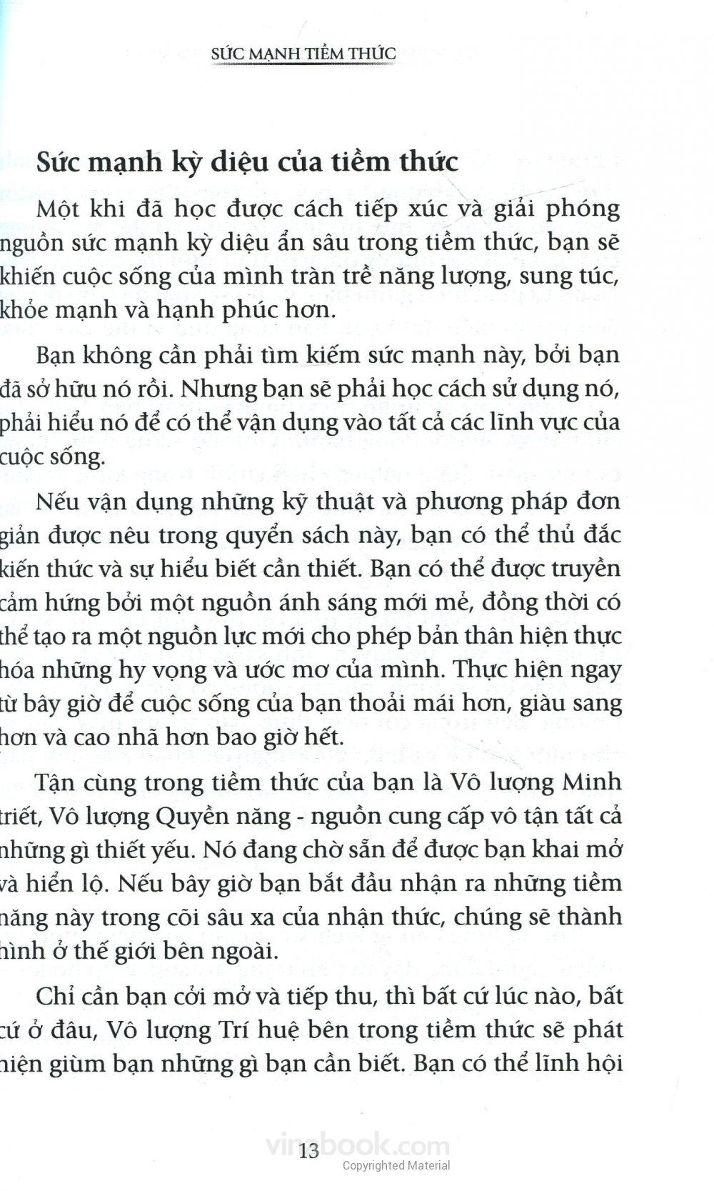 Sức Mạnh Tiềm Thức giới thiệu và giải thích các phương pháp tập trung tâm thức nhằm xoá bỏ những rào cản tiềm thức đã ngăn chúng ta đạt được những điều mình mong muốn.
