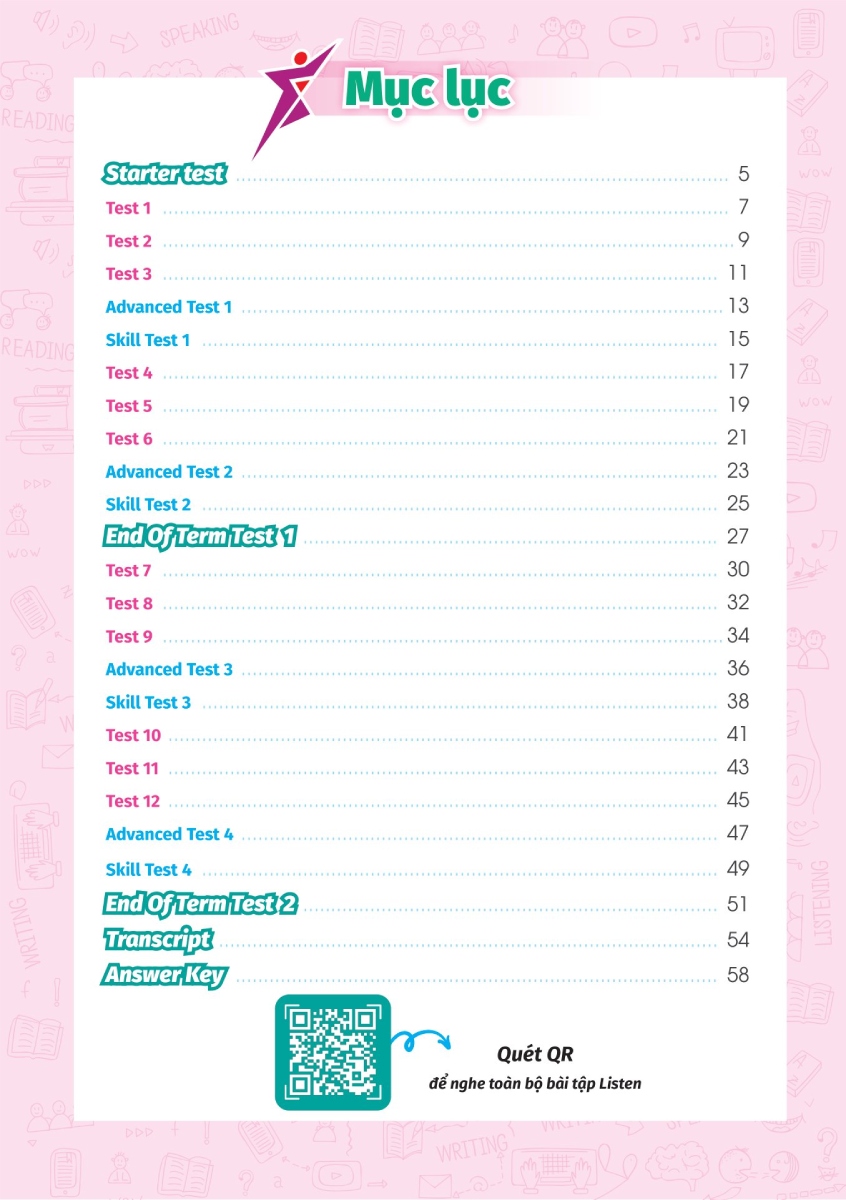 Bộ sách cung cấp các bài kiểm tra từ cơ bản đến nâng cao, bao gồm nhiều loại bài kiểm tra khác nhau, bao gồm kiểm tra từ vựng, kỹ năng nghe, đọc, viết và nói. Điều này giúp học sinh phát triển toàn diện các kỹ năng Tiếng Anh của họ và kiểm tra tất cả các khía cạnh của môn học.