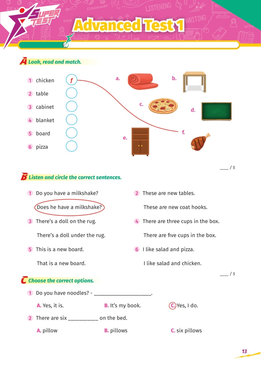 • Đối với các bài kiểm tra tổng hợp 1 (Advanced Test): 1 bài kiểm tra về từ vựng, 1 bài kiểm tra kĩ năng Nghe và 1-2 bài kiểm tra kĩ năng Đọc – Viết, 1 bài Ngữ âm.