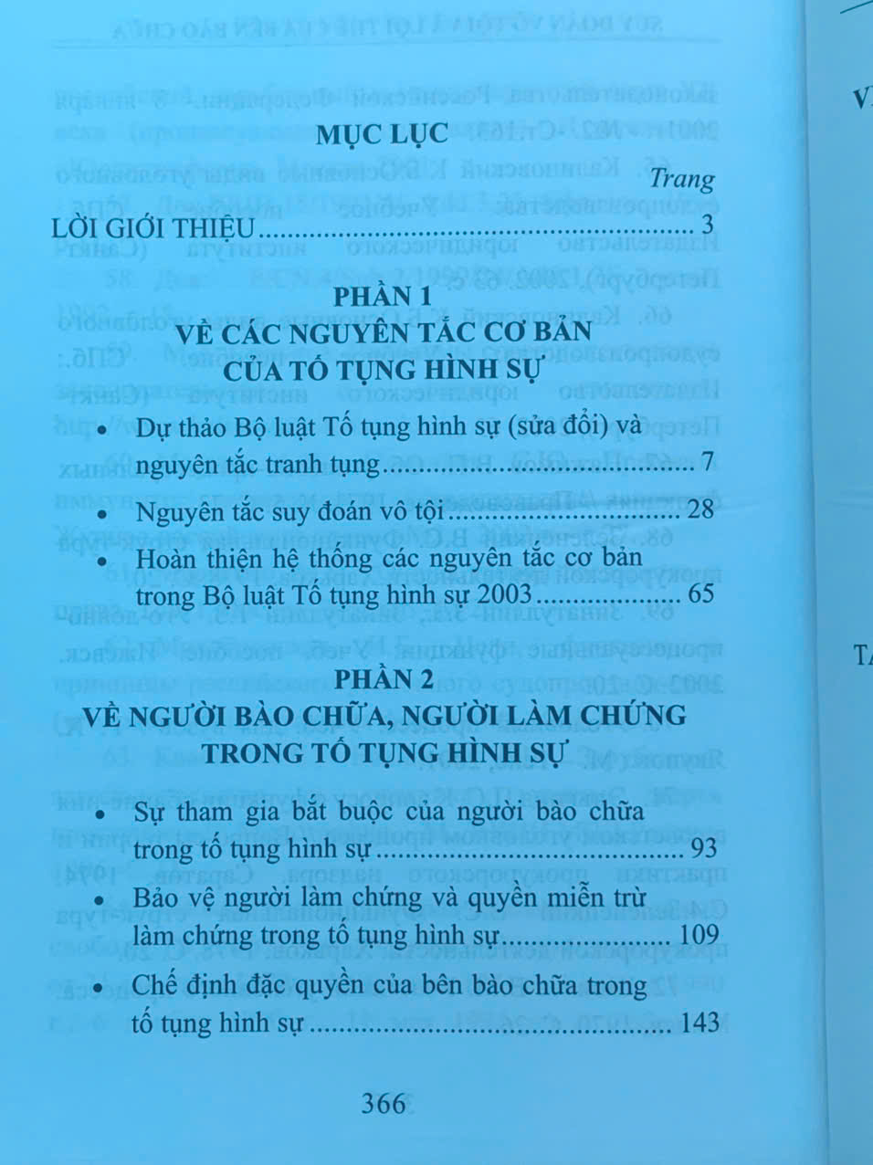 + Về các nguyên tắc cơ bản của TTHS như nguyên tắc tranh tụng, nguyên tắc suy đoán vô tội và vấn đề hoàn thiện hệ thống của các nguyên tắc cơ bản của TTHS.