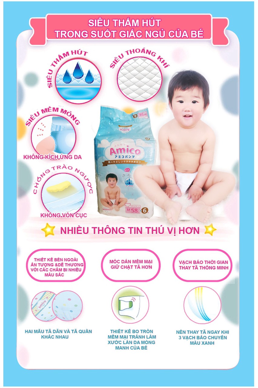 1. Thông tin về Tã giấy cao cấp AMICO của Nhật Thành phần: Chất liệu bông tự nhiên thân thiện với da bé, xốp mịn siêu mềm mại, thấm hút nhanh, chống tràn hiệu quả. Đặc tính quan trọng: Đặc tính siêu mỏng & hấp thụ tốt nhờ vào công nghệ chăm sóc da, với bề mặt tiếp xúc điểm xốp mịn với chất liệu polyethylene và cotton trên toàn bộ miếng tã luôn khô ráo, thoáng khí, mỏng nhẹ và không gây hằn đỏ lên làn da mỏng manh của bé. Ngoài ra, tính năng siêu thông thoáng dựa vào công nghệ siêu thoát khí từ chất liệu màng đáy thoát khí đặc biệt giúp bé yêu cảm thấy luôn dễ chịu , khô ráo và thông thoáng. Ngoài ra, miếng tã có khả năng siêu thấm hút với thời gian sử dụng lên đến 8 tiếng, bé có thể ngủ ngon suốt cả đêm dài với chỉ 1 miếng tã AMICO duy nhất mà cha mẹ cũng không phải lo lắng thức đêm thay tã cho con hoặc lo ngại về chi phí vì số lượng tã được thêm miếng cho mỗi gói nên sử dụng hết sức hợp lý và tiết kiệm.. ​                                         Hướng dẫn sử dụng: Chỉ với vài thao tác đơn giản, bạn đã có thể thay tã nhanh chóng để con yêu tiếp tục ngay các hoạt động mới.   ​Lưu ý : Không sử dụng tã dán cho bé lâu quá 6 tiếng liên tiếp, nên thoa kèm theo kem chống hăm trước khi sử dụng tã cho bé. Các loại tã dán AMICO theo cân nặng bé như sau:                                                                                                      Tã dán AMICO Newborn NB90+6                       – 96 miếng (trẻ sơ sinh < 5kg)           Tã dán AMICO size S82+6                                   – 88 miếng (trẻ từ 4 – 8kg)              Tã dán AMICO size M64+4                                 – 68 miếng (trẻ từ 6 – 11kg)                  Tã dán AMICO size L54+4                                   – 58 miếng (trẻ từ 9 – 14kg)                Các loại tã quần AMICO theo cân nặng bé như sau:                                                                                                       Tã quần AMICO size       M58+6                        – 64 miếng (trẻ từ 6 – 11kg)                  Tã quần AMICO size       L44+6                          – 50 miếng (trẻ từ 9 – 14kg)                   Tã quần AMICO size    XL38+6                           – 44 miếng (trẻ từ 9 – 14kg)                Tã quần AMICO size  XXL26+2                           – 28 miếng (trẻ từ 9 – 14kg)                                  Thông tin về thương hiệu: AMICO là thương hiệu Tã giấy cao cấp của Công ty AMICO tại Nhật Bản. Tất cả sản phẩm của AMICO đều được kiểm nghiệm nghiêm ngặt từ khâu sản xuất, vận chuyển, bán hàng nhằm đảm bảo chất lượng tốt nhất. Các loại tã bỉm của AMICO đem đến sự thông thoáng, mềm mại tuyệt vời cho làn da mỏng manh của bé và thông qua quy trình chọn lựa chất liệu bông tự nhiên cao cấp, kỹ càng.