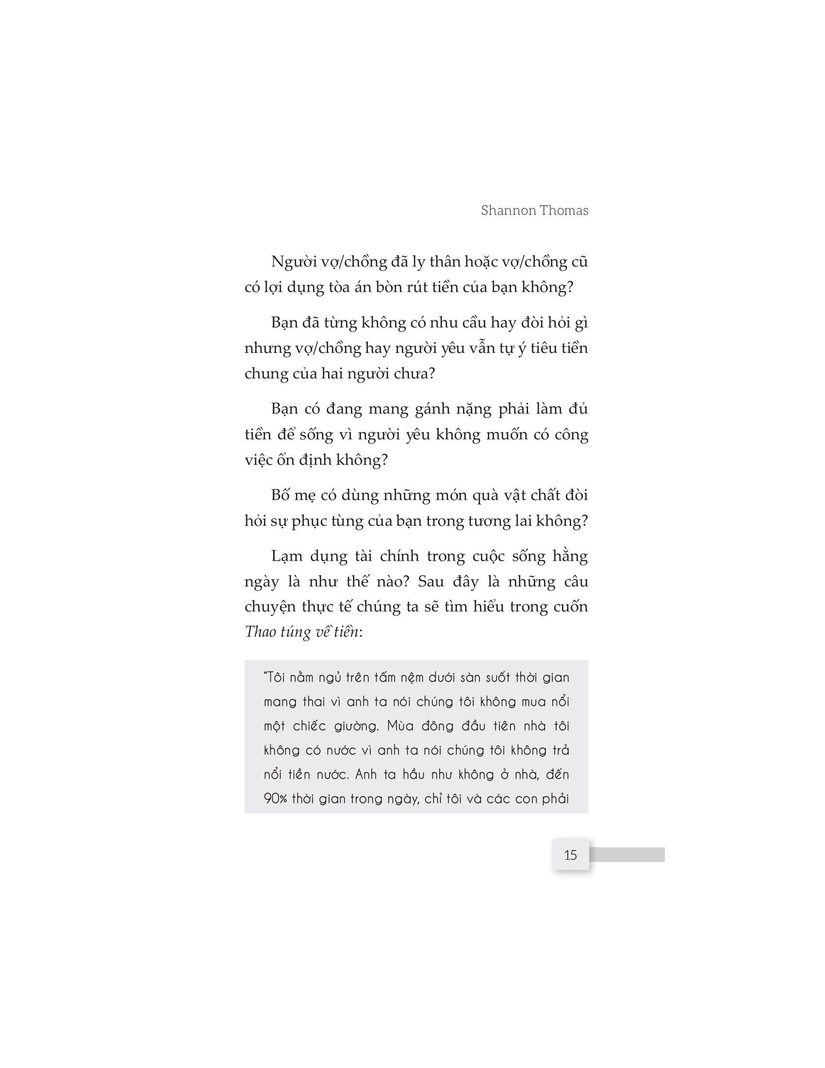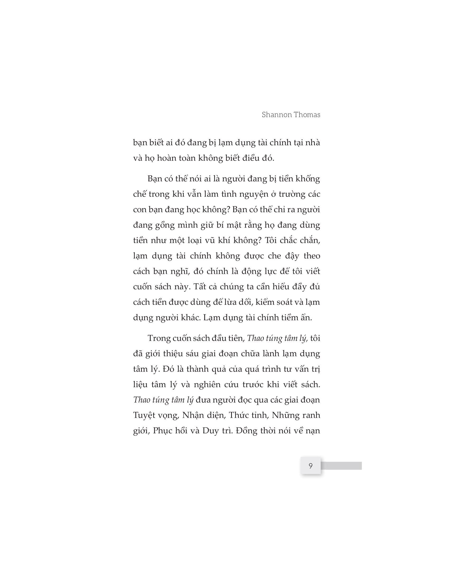 Cuốn sách “Thao túng về tiền” sẽ cho bạn cơ hội vén tấm màn che đậy và thấy được cuộc sống của những người bị tổn hại tài chính do những người thân thiết với họ gây ra. Nó cũng giúp bạn có được cái nhìn cụ thể và sâu sắc hơn về lạm dụng tài chính để nhận biết sớm, có hành động dứt khoát giúp bạn thoát khỏi hố sâu tâm lý và chữa lành những tổn thương tiềm ẩn.