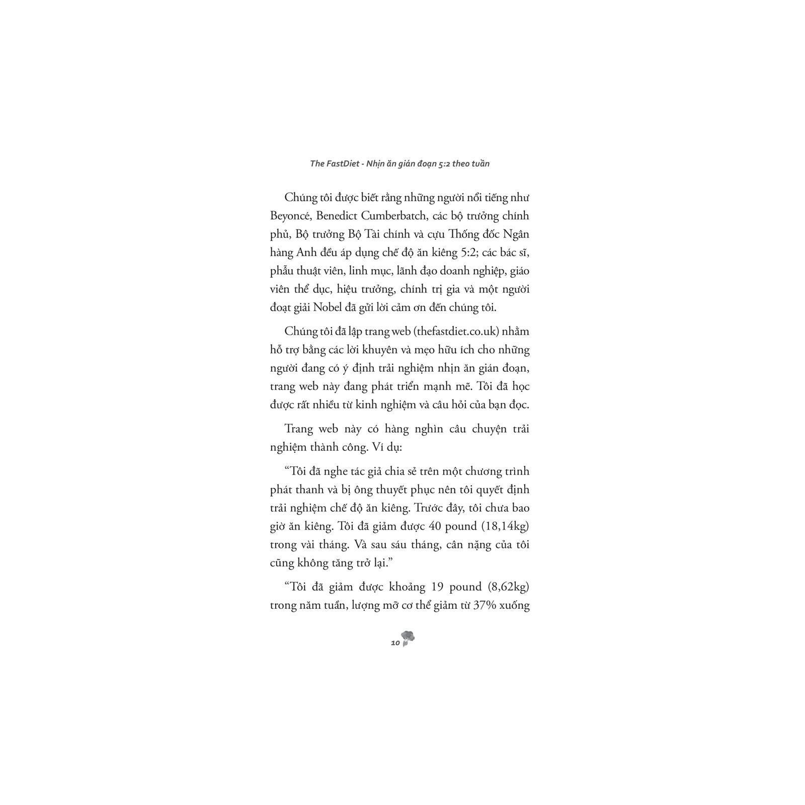 Cuốn sách không chỉ dừng lại ở chuyện giảm cân, Michael Mosley (một bác sĩ kiêm nhà báo nổi tiếng) cùng Mimi Spencer (một chuyên gia ẩm thực tài hoa), đã chứng minh rằng nhịn ăn gián đoạn còn giúp tái khởi động cơ thể bạn từ bên trong: giảm nguy cơ mắc các bệnh nguy hiểm như tiểu đường loại 2, tim mạch, thậm chí cả ung thư, đồng thời tăng cường tuổi thọ và cải thiện trí não. Đặc biệt, cuốn sách còn được trang bị những công thức nấu ăn ngon miệng, dễ làm, phù hợp với cả những người bận rộn nhất.