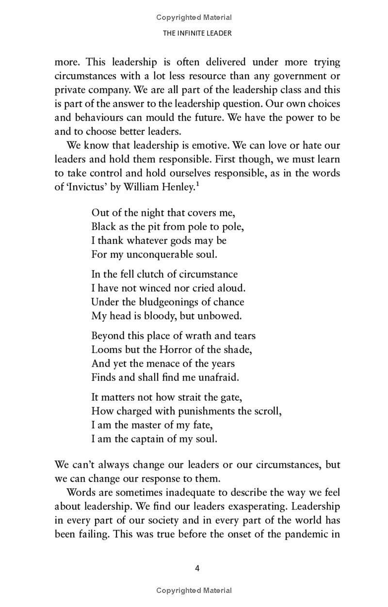 The Infinite Leader is a roadmap to introducing balance back into organizations. You can adapt your stance to the infinite possibilities facing you as a leader, and balance the main quadrants of the rational, emotional, spiritual and physical leader, to deliver sustainable leadership with integrity. Business is still about people - people operate across paradoxes and opposing forces, in a world that confounds these influences. Leaders need to continuously juggle and neutralize these to succeed. Be what your people need you to be and learn what they don't teach you in business schools; remain analytical and numbers-focused when needed, but also bring your heart, person and integrity to leadership.