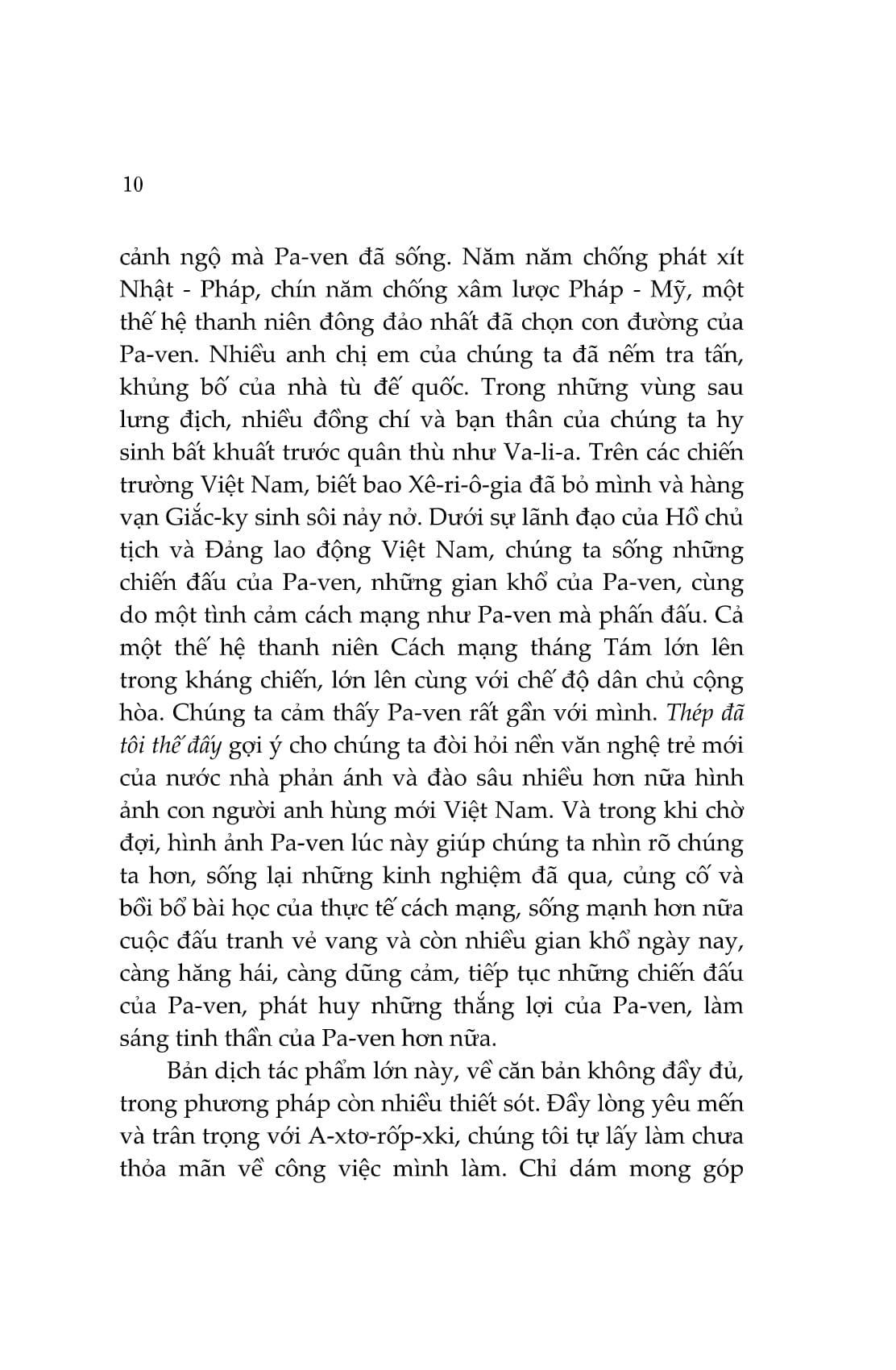 Thép ở đây là Pa-ven, là Xê-ri-ô-gia, là Va-li-a, là Giác ky, cả một lớp thanh niên lao động, vừa lớn lên thì gặp ngay cách mạng, ý thức giai cấp và tuổi trẻ bừng lên trong bão táp của phong trào. Lò ngàn độ nóng tôi rèn họ là cuộc đấu tranh thật trường kỳ gian khổ, thật là tự lực cánh sinh của cách mạng tháng Mười. Người thợ vĩ đại tôi rèn thép ấy là Đảng cộng sản, ngọn cờ và bộ tham mưu của cách mạng. Đảng lần lượt lãnh đạo chiến tranh, đảm bảo cung cấp, tổ chức vận tải, xây dựng đường sắt, trấn áp tàn dư phản cách mạng, tổ chức lực lượng nhân dân rộng lớn và thiết lập chính quyền cách mạng vững mạnh, lãnh đạo phục hồi sản xuất và kiến thiết, dắt dẫn nhân dân đi vào một xã hội mới - xã hội chủ nghĩa - chưa từng có bao giờ. Trong đấu tranh vũ trang cũng như công tác xây dựng, Đảng tập dần thói quen cho Pa-ven chiến thắng. Pa-ven từng bước một trưởng thành, trở nên một chiến sĩ cách mạng già dặn. Bệnh tật mười chết một sống là trận thử thách cuối cùng. Pa-ven là thép đã tôi rồi nên đã thắng, toàn thắng.