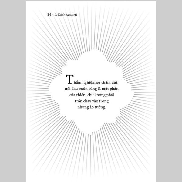 Và quan trọng hơn hết, thiền là sự tự do vượt thoát mọi điều đã biết. “Thiền không phải là tụng niệm những từ ngữ, ngồi trong góc tối, nhìn vào những sự phóng chiếu, hình ảnh và ý niệm của chính mình. Thiền là làm sáng tỏ cái đã biết và tự giải thoát mình khỏi cái đã biết.” Qua mỗi trang, mỗi câu, ta dần dần tự xây dựng cho mình cách hiểu riêng và khai ngộ về thiền.
