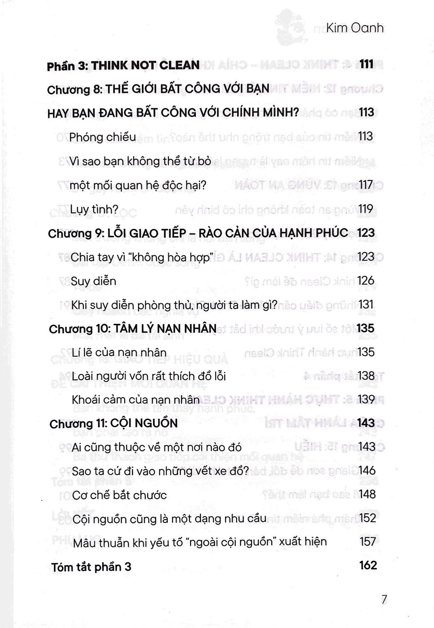 “Think Clean là một ý tưởng, cũng là một phương pháp luyện tập tâm trí do tôi – Kim Oanh tin tưởng và xây dựng dựa vào quan điểm rằng: Phần lớn các khó khăn về mặt tâm lý của con người đều xuất phát từ cách chúng ta nhìn nhận và đánh giá về chính bản thân m.ình. Khi bạn có một cái nhìn lành mạnh về bản thân, bạn sẽ nhờ đó mà có một cái nhìn khách quan và lành mạnh hơn về thế giới (bao gồm những người xung quanh bạn, những mối quan hệ bạn sở hữu, những sự việc, hiện tượng diễn ra trong đời sống của bạn ở quá khứ, hiện tại, lẫn tương lai).