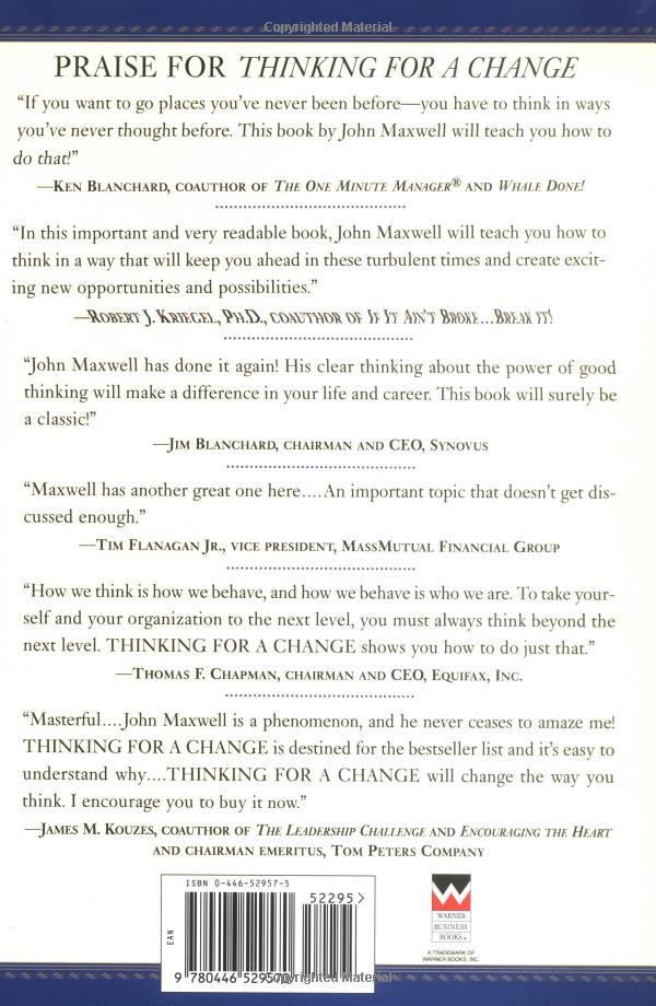 Good thinking. It's the one thing all successful people have in common. People who achieve their dreams understand the critical relationship between their level of thinking and their level of progress - and know that when thinking is limited so is potential. John C. Maxwell explores the idea and identifies the specific skills people need to make their potential for success explode into results. From focused and creative thinking to thinking of the big picture or the bottom line, he provides examples of effective thinking for every situation. The book doesn't tell you what to think but how to think. After all, success is as simple as changing your mind!