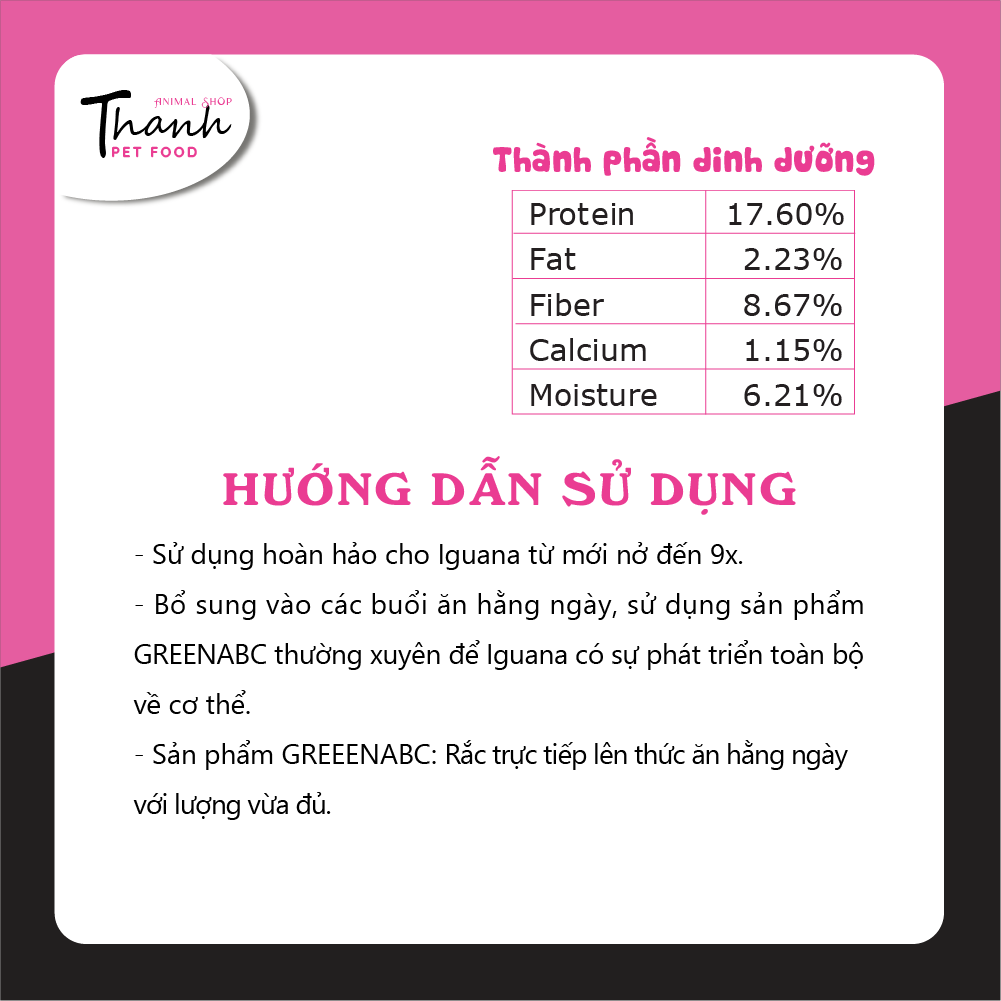 THỨC ĂN BÒ SÁT - BỔ SUNG DINH DƯỠNG PROTEIN, CANXI, LIPID GREENABC là thức ăn cao cấp dành cho các loại bò sát: IGUANA, BEARDED DRAGON, LEOPARD GECKO. Đặc biệt sản phẩm GREENABC được