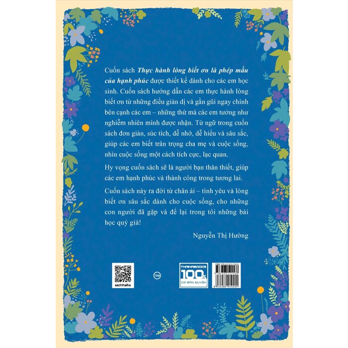 "Thực hành lòng biết ơn là phép màu của hạnh phúc" là món quà ý nghĩa dành tặng các em học sinh, các bậc cha mẹ và thầy cô giáo. Cuốn sách không chỉ giúp các em hình thành thói quen biết ơn, mà còn bồi dưỡng tâm hồn, nuôi dưỡng lòng trắc ẩn, và kiến tạo một cuộc sống hạnh phúc, tích cực.
