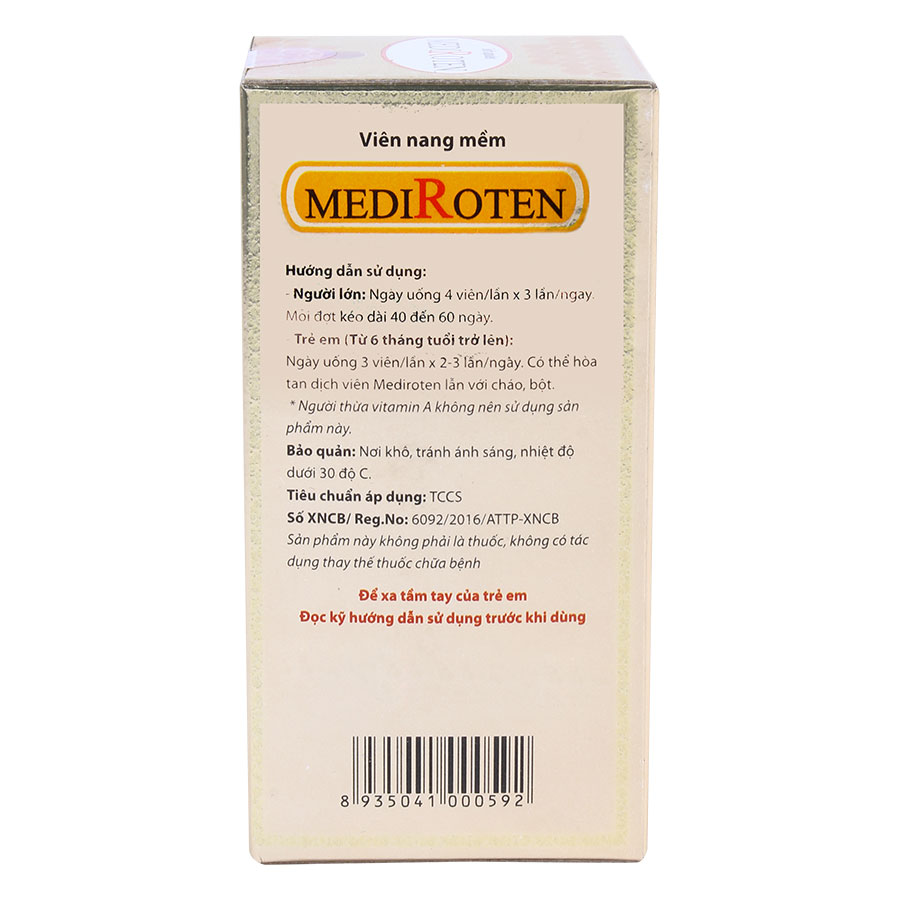 Dùng viên Mediroten giúp phục hồi sức khoẻ nhanh chóng và ngăn chặn các nguy cơ gây ung thư. Phòng và hỗ trợ điều trị suy dinh dưỡng, thiếu vitamin, bổ mắt, có tác dụng làm sáng mắt, hỗ trợ điều trị khô mắt, mờ mắt, sạm da, trẻ em chậm lớn, suy dinh dưỡng do thiếu vitamin A.