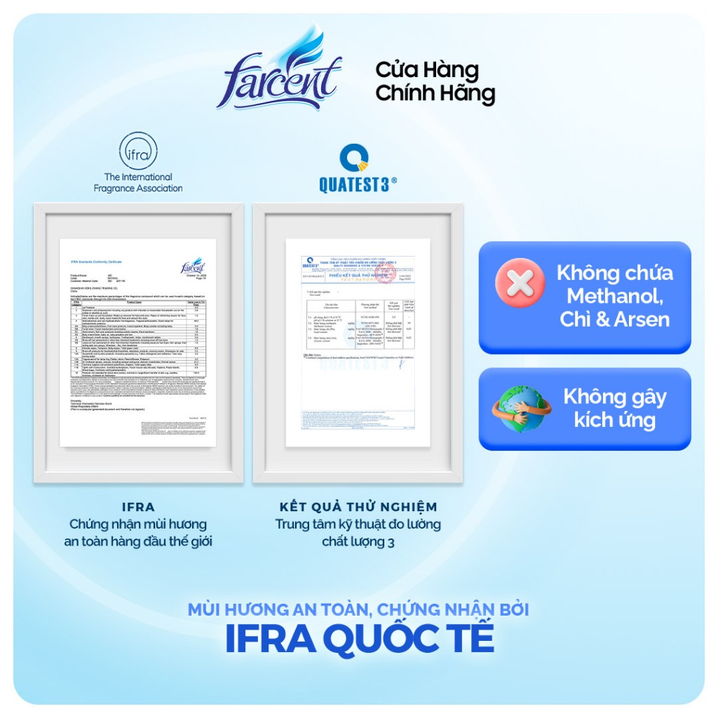 - Các sản phẩm Farcent sử dụng các thành phần được chứng nhận an toàn sức khỏe bởi Hiệp Hội Mùi Hương Quốc Tế IFRA.