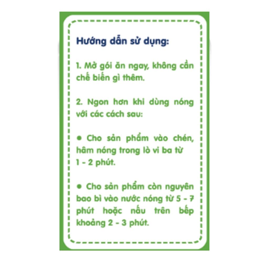 - Ngon hơn khi dùng nóng với các cách sau: • Mở gói, cho sản phẩm vào chén, hâm nóng trong lò vi sóng từ 1 – 2 phút. • Cho sản phẩm còn nguyên bao bì vào nước nóng khoảng 5 – 7 phút hoặc nấu trên bếp khoảng 2 – 3 phút. Hạn sử dụng: 12 tháng kể từ ngày sản xuất. Đối tượng sử dụng: Trẻ từ 10 tháng tuổi và người lớn. Thương hiệu : Sài Gòn Food. Xuất xứ: Việt Nam.