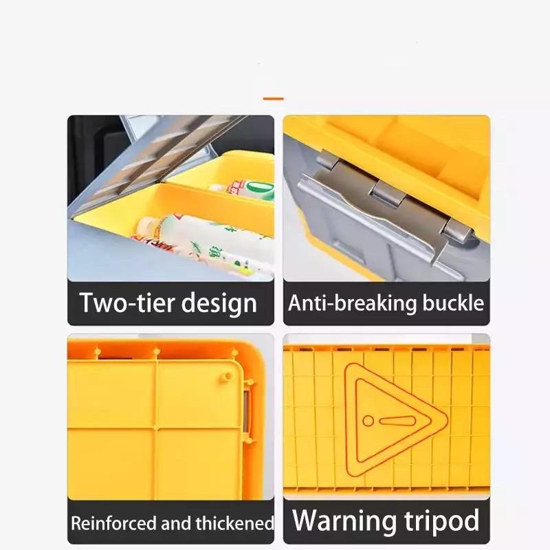 - Thùng đựng đồ ô tô xe hơi - thùng đựng đồ gấp gọn đa năng siêu dày có nắp đậy nắp thiết kế riêng biệt vừa chưa được hàng hóa và vừa giúp chồng được nhiều thùng lên nhau, nắm kín giúp chống bụi tốt. Thùng đựng đồ ô tô xe hơi - thùng đựng đồ gấp gọn đa năng siêu dày tiện dụng, không chỉ dùng đựng đồ cốp xe ô tô xe hơi khi đi dã ngoại, còn rất hữu ích khi sử dụng đựng đồ dùng, quần áo trong nhà. Đặc biệt, khi kết hợp với túi chống thấm bạn có thể sử dụng đựng thực phẩm, đồ hải sản như tôm, cá, cua, mực,...mà không sợ lấm bẩn, thấm nước ra xe hay sàn nhà.