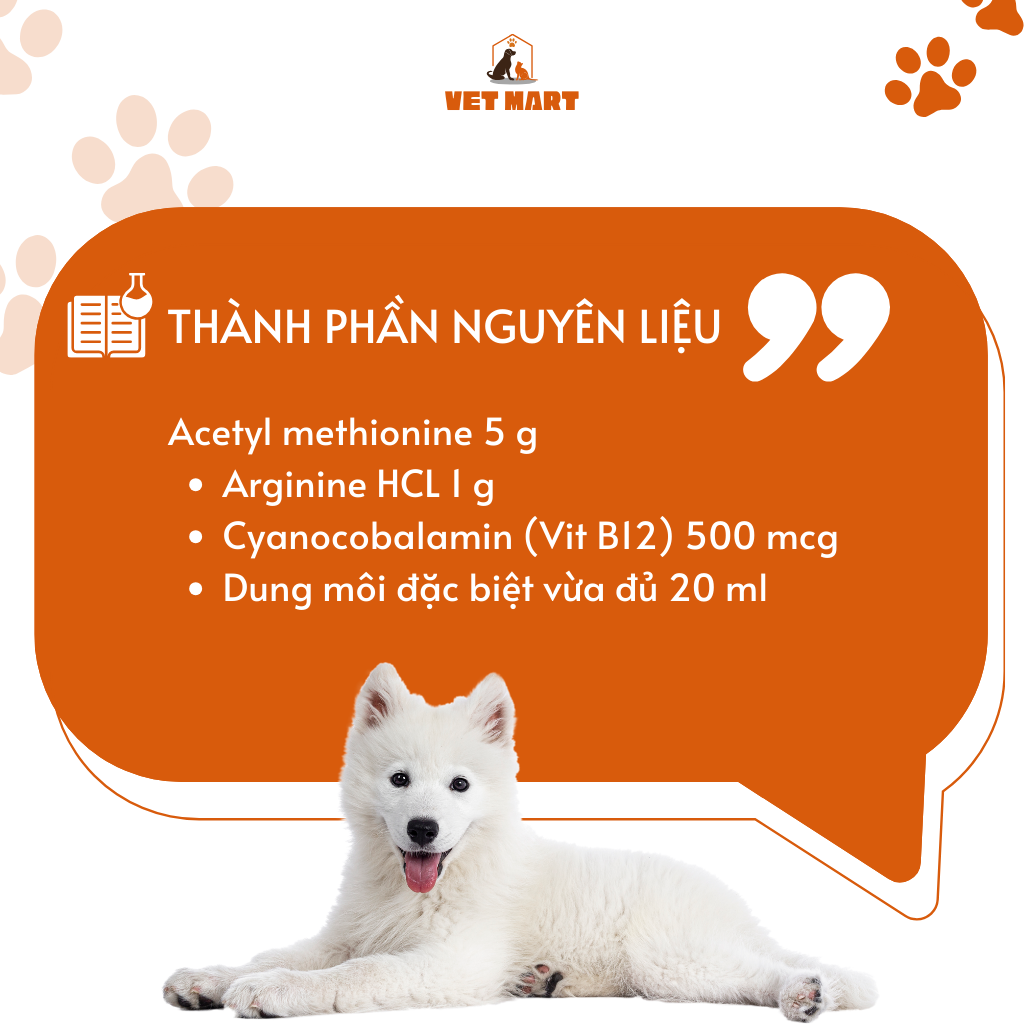 Vemedim Vimekat plus chứa vitamin và amino acid, tăng cường sức khỏe chó, mèo, chim cảnh, gá đá, chai 20ml THÀNH PHẦN: (1-n-butylamino-1-methyl) ethylphosphonic acid 400 mg Vitamin A 10 000 IU Vitamin D3 1