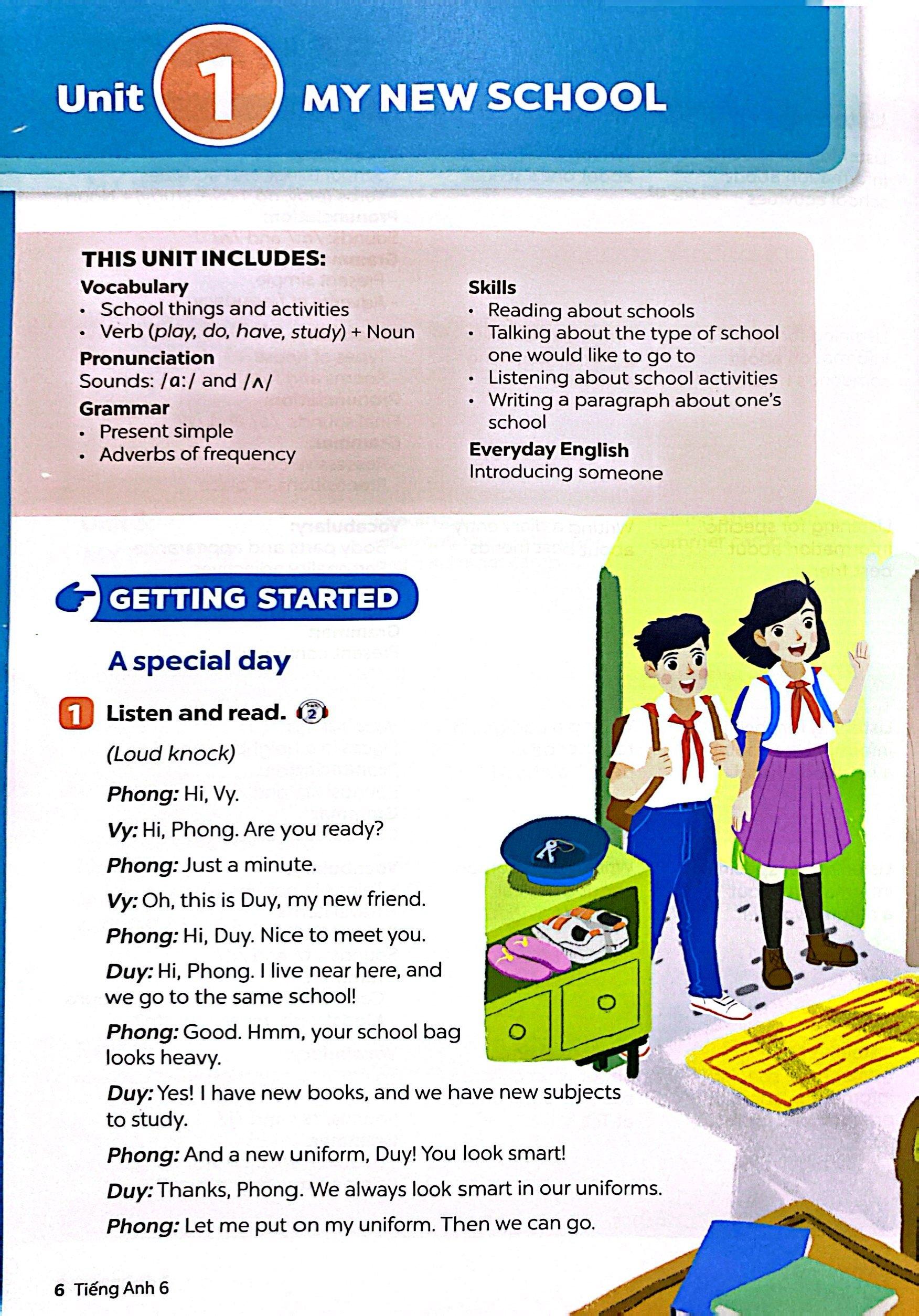 Tiếng anh 6 được NXB Giáo Dục Việt Nam tổ chức biên soạn theo chương trình giáo dục phổ thông: chương trình môn tiếng anh theo thông tư số 32/2018/TT-BGDĐT ngày 26 tháng 12 năm 2018 của Bộ trưởng Bộ Giáo dục và Đào tạo, tiếp theo Tiếng Anh 3, Tiếng Anh 4 và Tiếng Anh 5. Sách được biên soạn theo đường hướng giao tiếp, giúp học sinh sử dụng ngữ liệu (ngữ âm, từ vựng, ngữ pháp) để phát triển năng lực giao tiếp bằng tiếng Anh thông qua bốn kĩ năng nghe, nói, đọc và viết. Tiếng Anh 6, tập một lấy hoạt động học là trung tâm, học sinh là chủ thể của quá trình dạy học, trong đó tâm lý lứa tuổi của học sinh trung học cơ sở, các đặc điểm văn hoá của Việt Nam và của các nước trên thế giới, đặc biệt là của các nước nói tiếng Anh, được coi trọng.