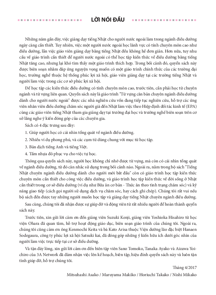 - Giới thiệu tóm tắt tác phẩm: Nằm trong bộ sách Tiếng Nhật chuyên ngành điều dưỡng. Quyển "Từ vựng cơ bản" này là tổng hợp các từ vựng chuyên ngành điều dưỡng, kèm bản dịch Anh Việt và các câu ví dụ bám sát hiện trường làm việc thực tế. Giúp người học có cái nhìn tổng quát về ngành điều dưỡng. Có đính kèm tấm nhựa đỏ phục vụ việc tự học. Đây là giáo trình rất bổ ích cho những người đang học ngành điều dưỡng, hoặc muốn làm việc trong ngành điều dưỡng tại Nhật Bản.