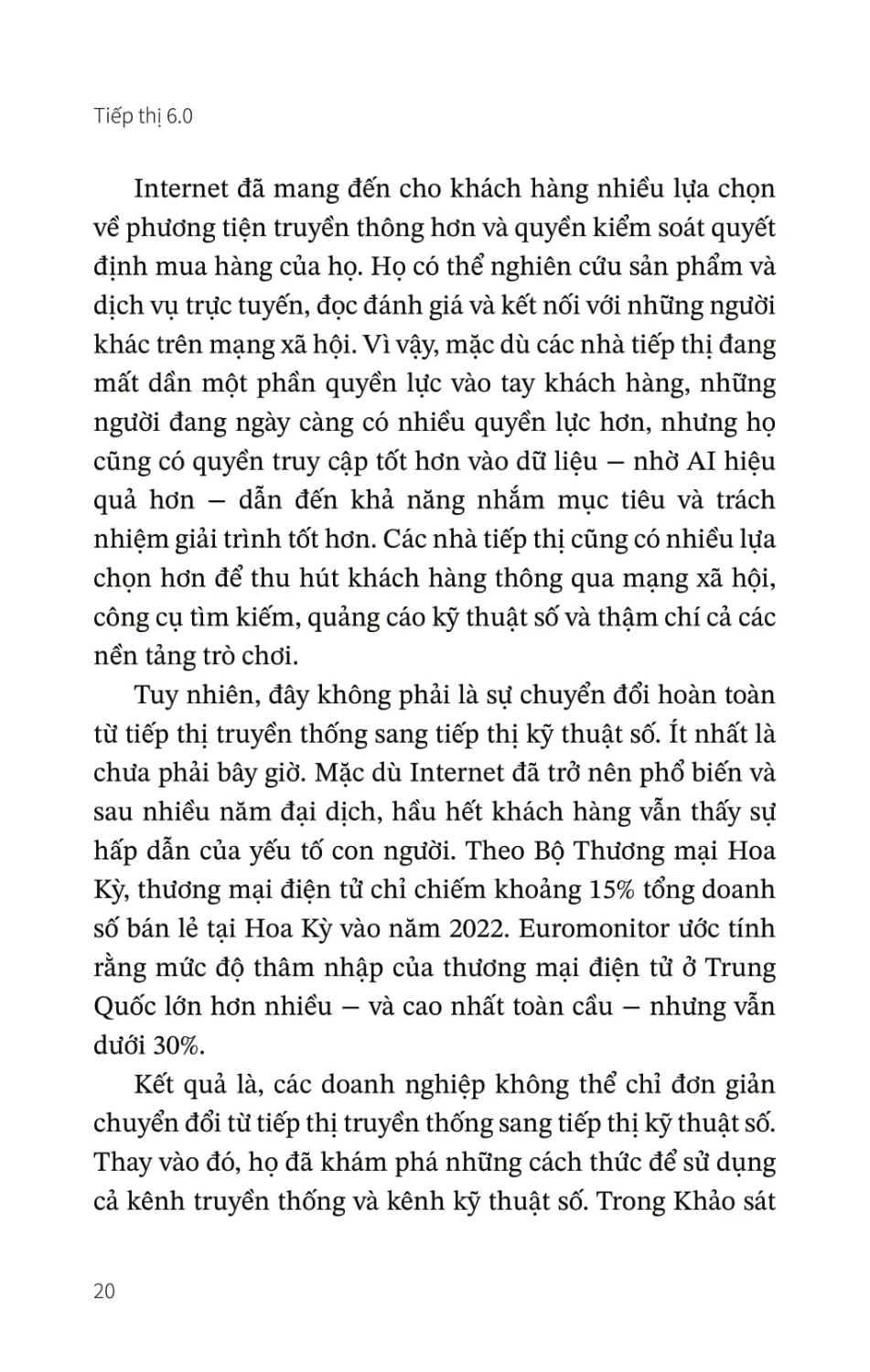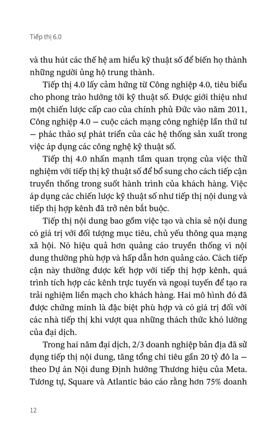 Trong "Tiếp thị 6.0", Philip Kotler, nhà tiếp thị nổi tiếng đã phổ biến khái niệm "4P trong tiếp thị", giải thích cách các nhà tiếp thị có thể sử dụng công nghệ để đáp ứng nhu cầu của khách hàng và tạo ra sự khác biệt. Trong thời đại mới tiếp thị siêu kênh (metamarketing) ngày nay, cuốn sách này sẽ cung cấp cho các nhà tiếp thị cách tích hợp sự phát triển công nghệ và mô hình kinh doanh với những thay đổi đáng kể trong hành vi của người tiêu dùng đã xảy ra trong thập kỷ qua.