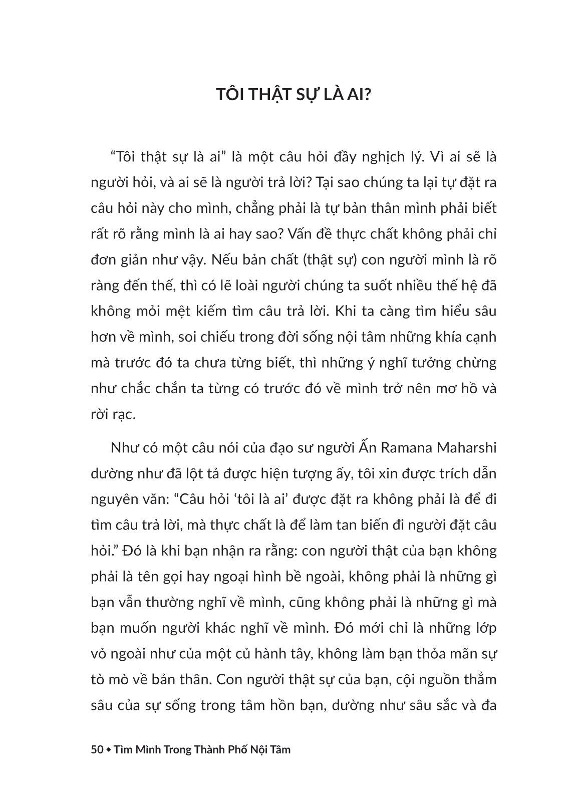 Cùng những chương sách được trải ra như một tấm bản đồ, Tìm m.ình trong thành phố nội tâm sẽ từng bước dẫn dắt bạn khám phá không gian nhiệm màu ấy, lý giải các diễn biến tinh thần thông qua lăng kính của Triết học và Tâm lý học cùng những góc nhìn và câu chuyện đã được chứng minh. Cuốn sách sẽ giúp bạn tiến đến ngưỡng hạnh phúc thật sự khi hiểu rõ về bản thân, sống hòa hợp được với cả thế giới bên trong và bên ngoài m.ình.