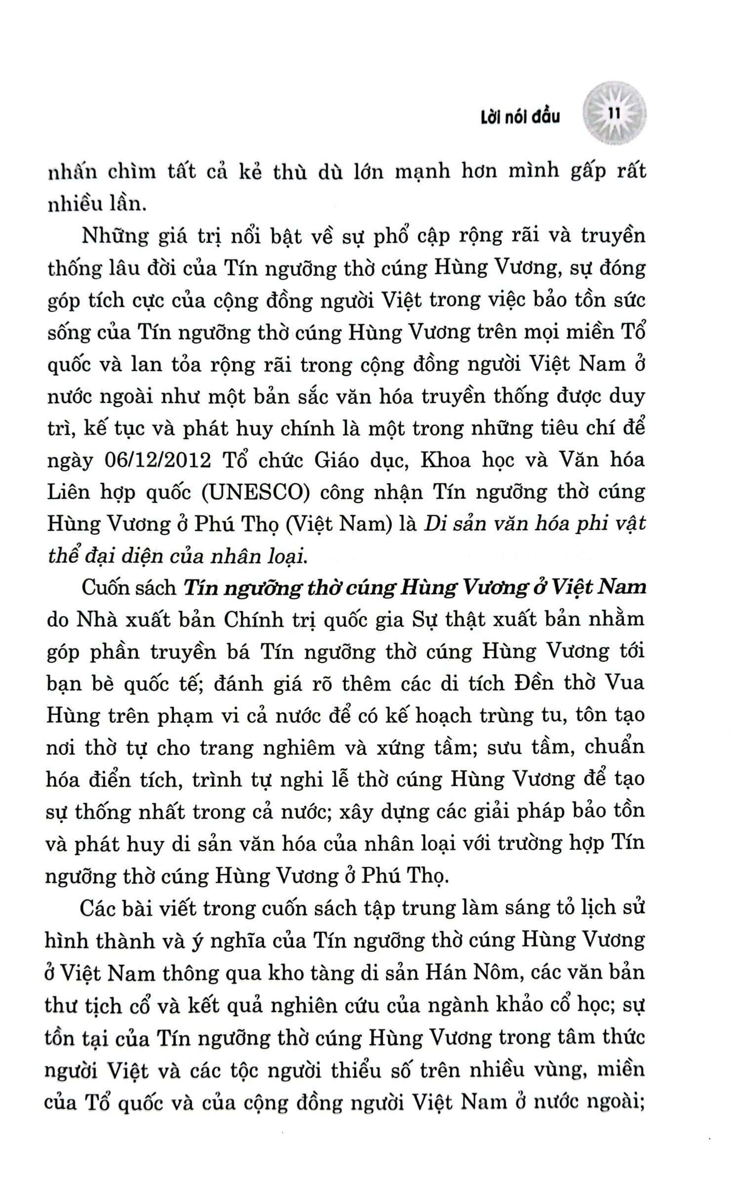 Giúp độc giả hiểu sâu hơn về nguồn gốc lịch sử, ý nghĩa, giá trị văn hóa của Tín ngưỡng thờ cúng Hùng Vương từ nhiều góc độ, cũng như việc khai thác, phát huy các giá trị của loại hình tín ngưỡng này ở trong và ngoài nước hiện nay. Mỗi bài viết đều thể hiện sự tâm huyết, thành kính của tác giả đối với Quốc Tổ, Quốc lễ của dân tộc.
